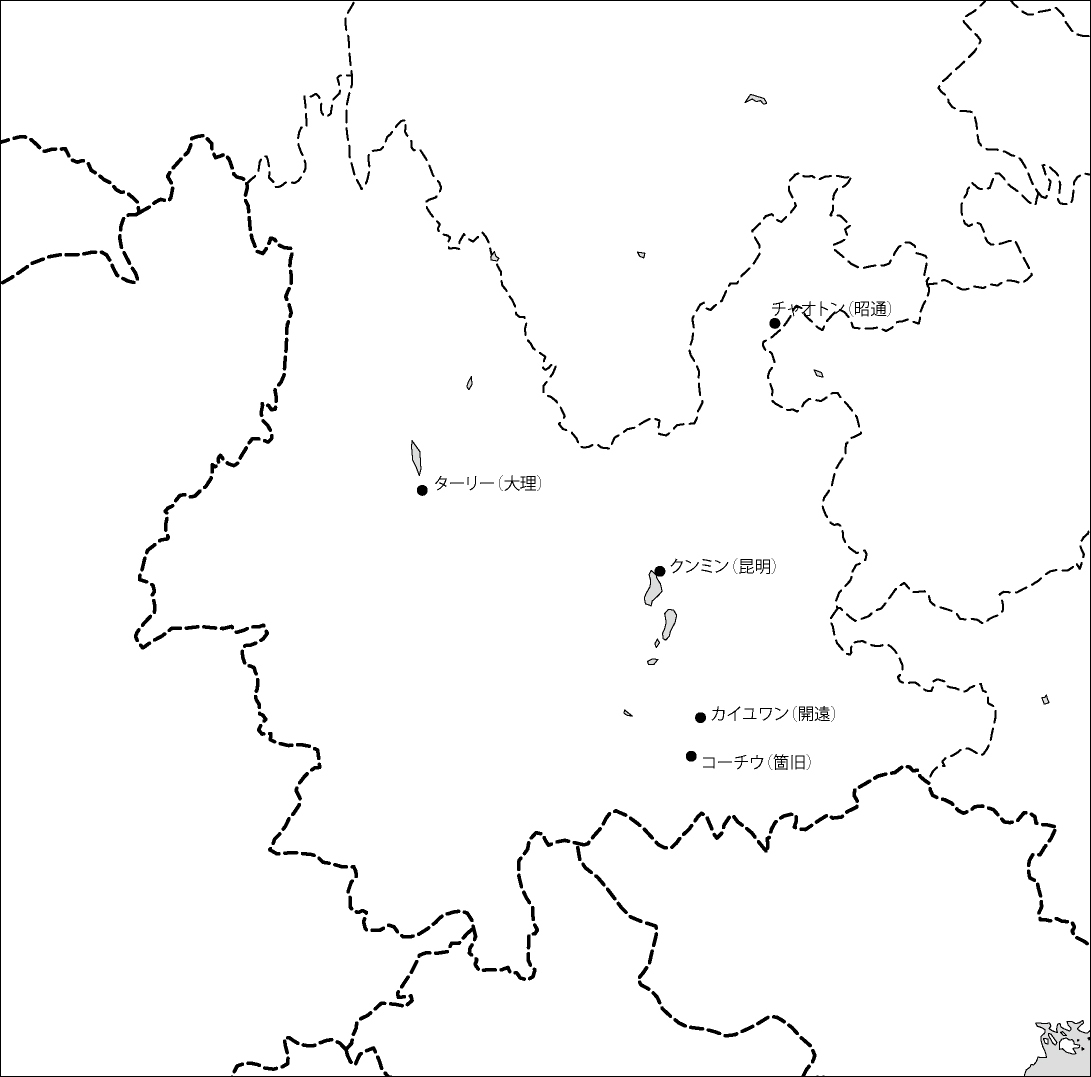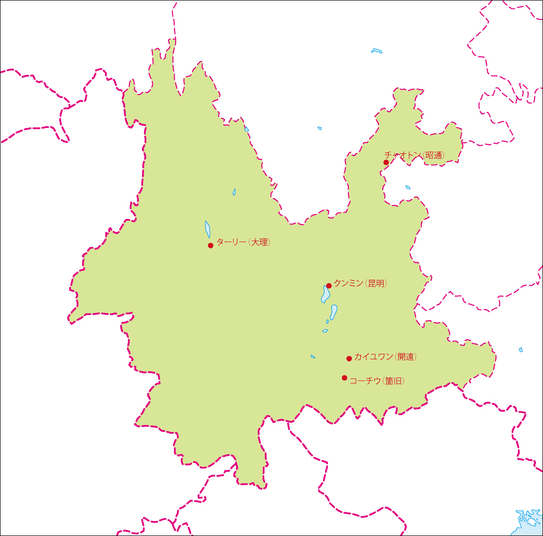同省は中国の南西に位置し、東は貴州省、広西チワン族自治区、北は四川省、チベット族自治区、西はミャンマー、南はラオス、ベトナムに隣接する。雲南高原、滇東高原など海抜2000メートル平均の同省は約90%が山地で占められている。同省の北部は熱帯、南部は亜熱帯気候で、夏季の平均気温は19度から22度、冬季は6度から8度である。6月から8月は雨期で、年降水量の60%を占める。同省には面積が1平方キロ以上ある湖が37あり、その中でも大理アル海や撫仙湖は水質がきれいで澄んでいることで有名である。タバコの生産量は中国一を誇りプーアル茶やコーヒー、マンゴーの代表的な産地である。