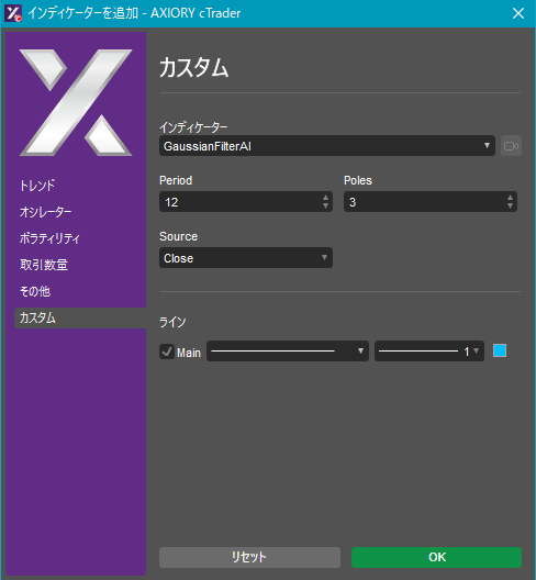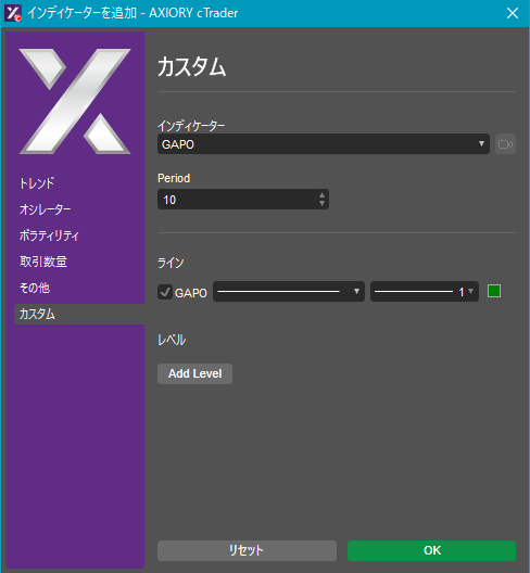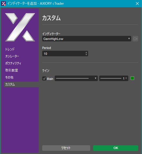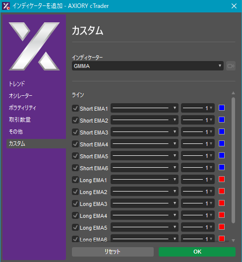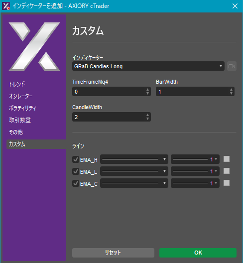 cTraderに表示するカスタムインディケーターの一覧です。 Gから始まるインディケーターです。[表示]のあるものは画面に表示された画像が見られます。 うまくインディケーターをダウンロードできない方は、 インディケーター名の上で[マウスを右クリック]→[対象をファイルに保存]を選んで保存して下さい。