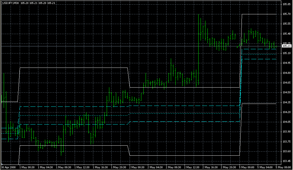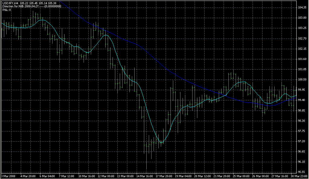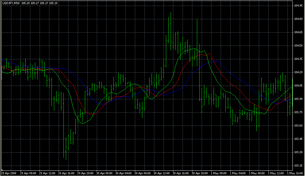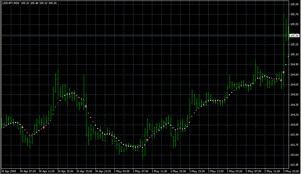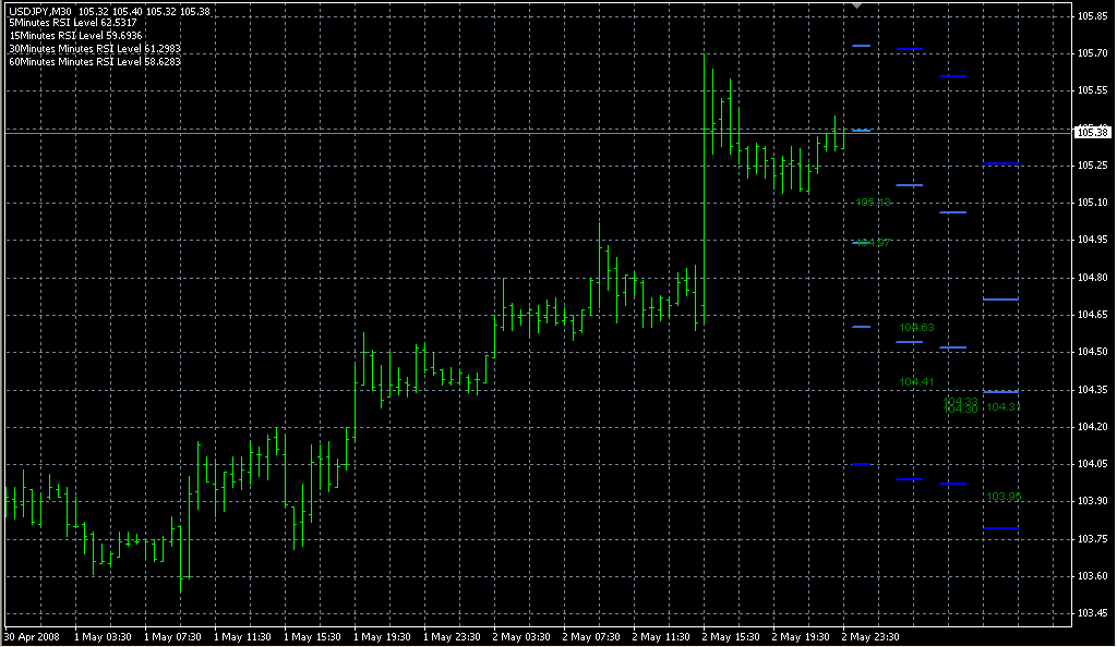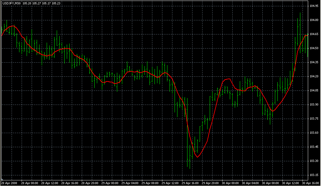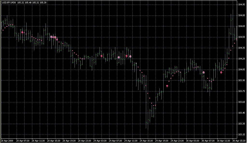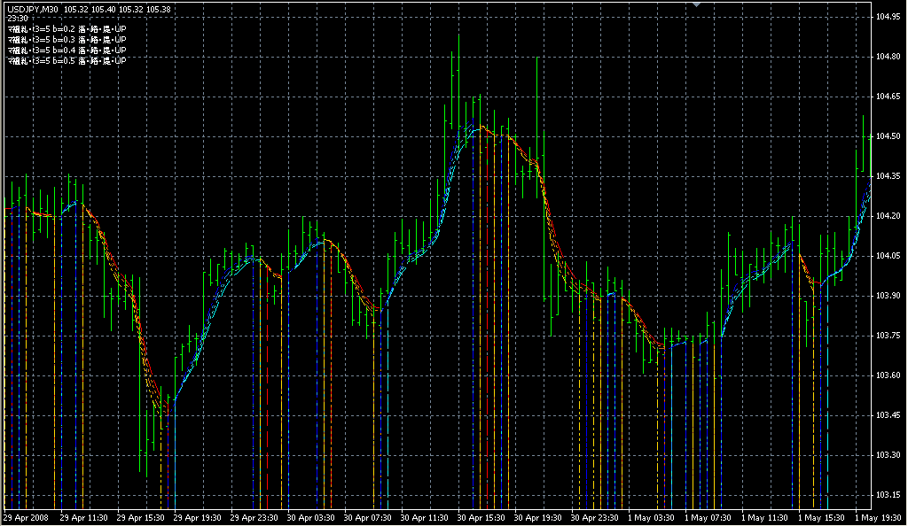 FXのフリーのチャートソフト、メタトレーダー4 (MT4)にインディケーターを表示させた画像です。