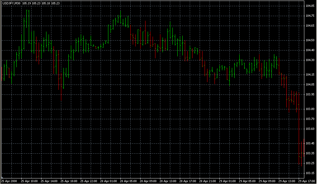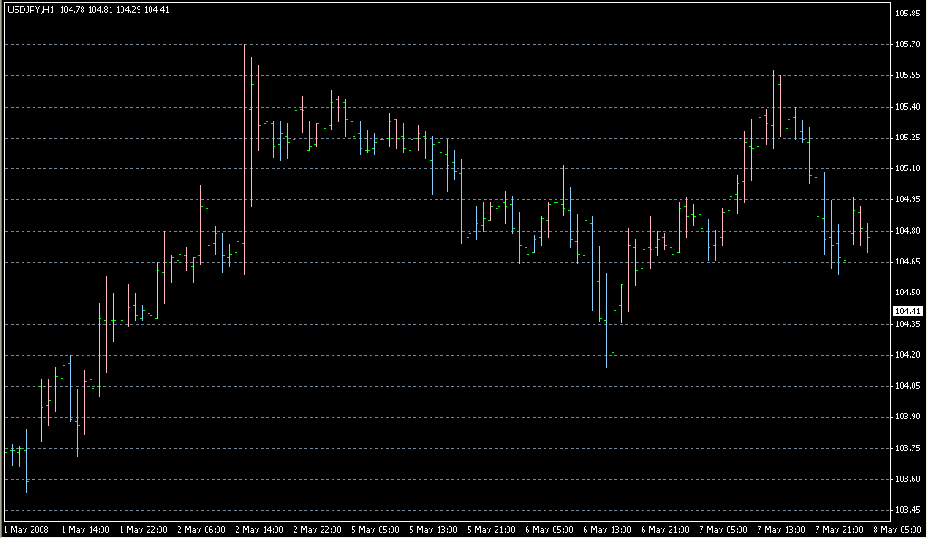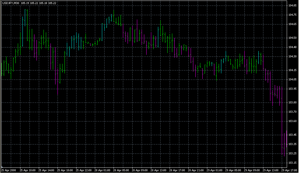 FXのフリーのチャートソフト、メタトレーダー4 (MT4)にインディケーターを表示させた画像です。