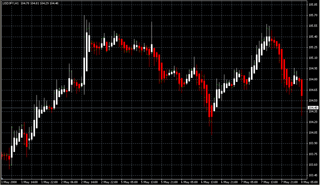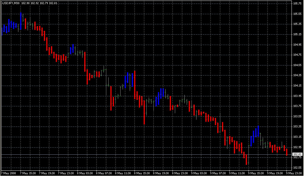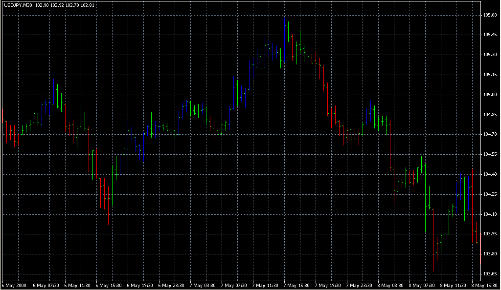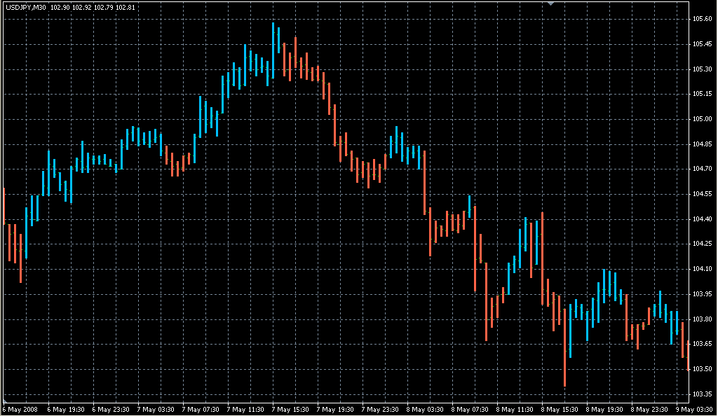 FXのフリーのチャートソフト、メタトレーダー4 (MT4)にインディケーターを表示させた画像です。