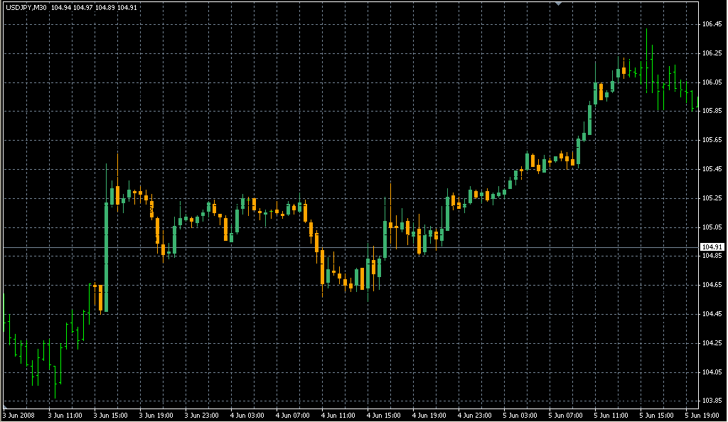 FXのフリーのチャートソフト、メタトレーダー4 (MT4)にインディケーターを表示させた画像です。