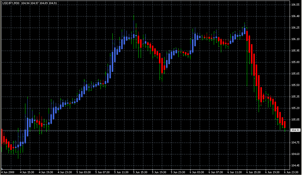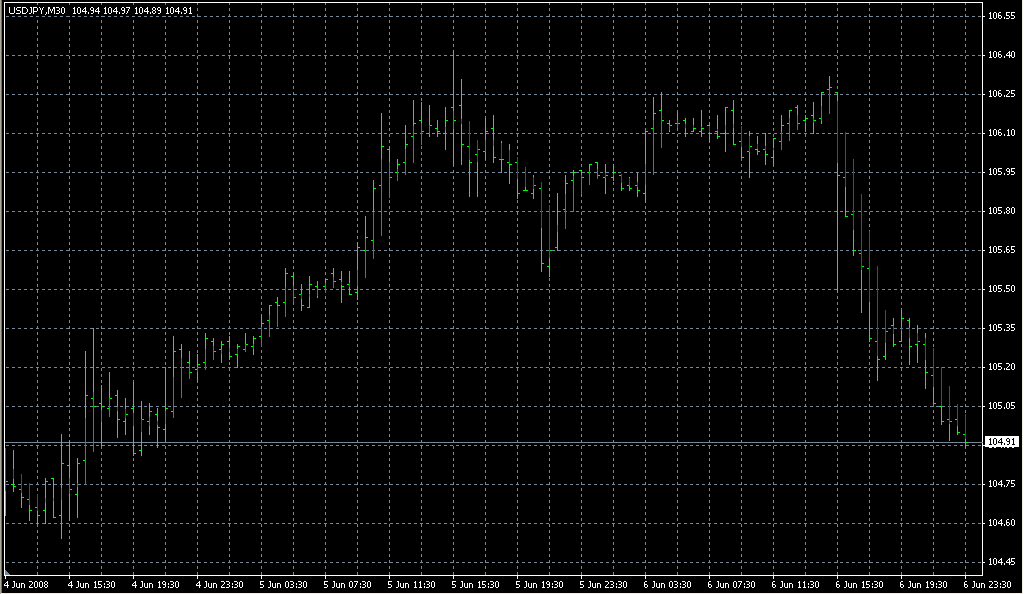 FXのフリーのチャートソフト、メタトレーダー4 (MT4)にインディケーターを表示させた画像です。