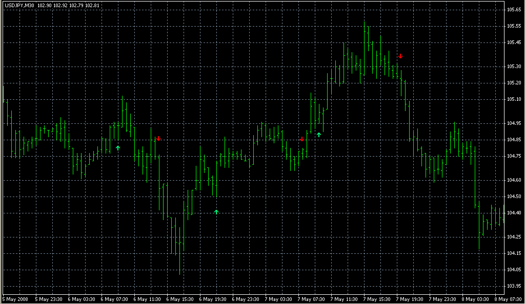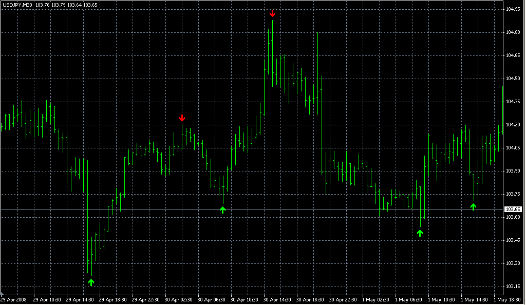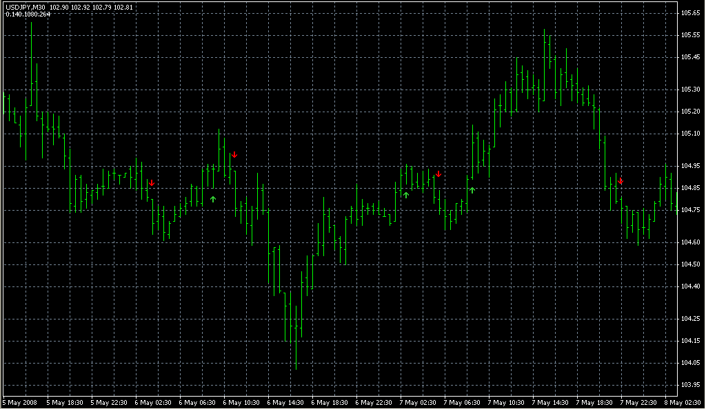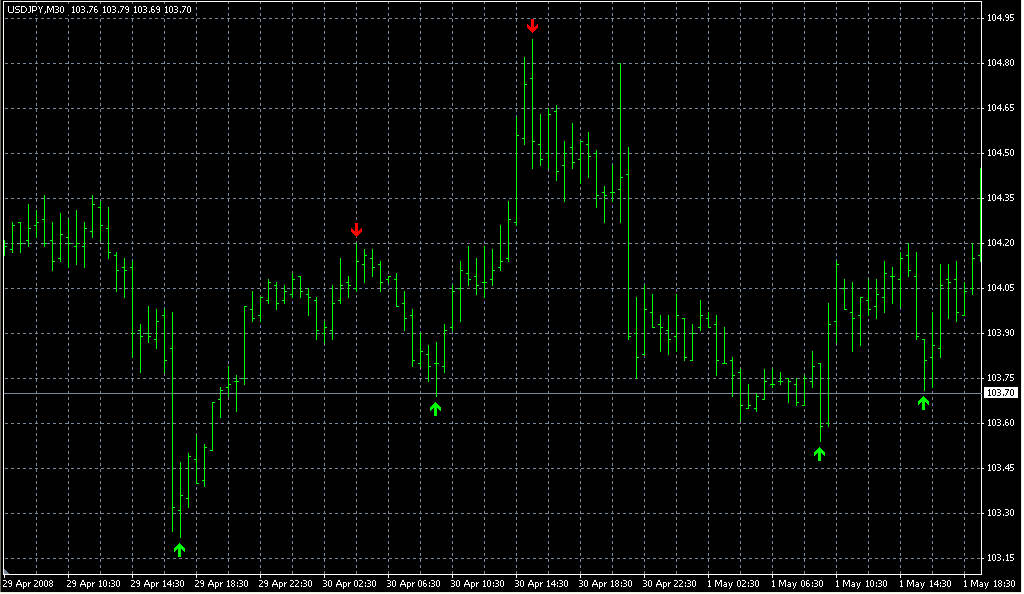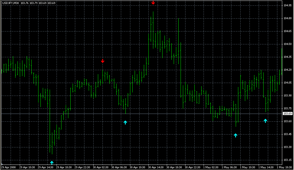 FXのフリーのチャートソフト、メタトレーダー4 (MT4)にインディケーターを表示させた画像です。