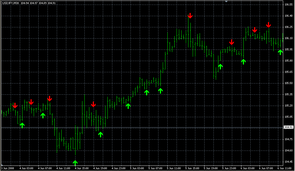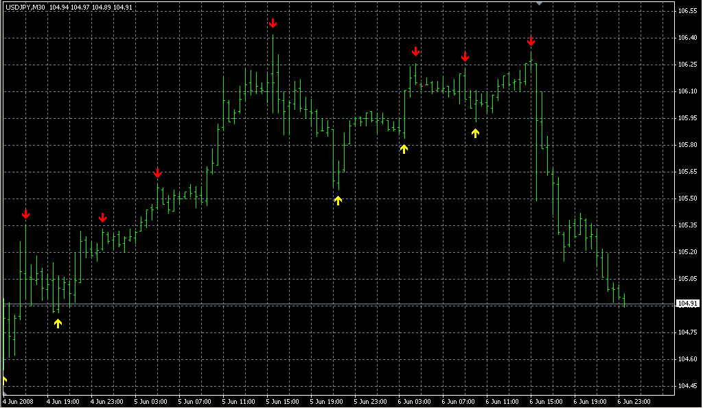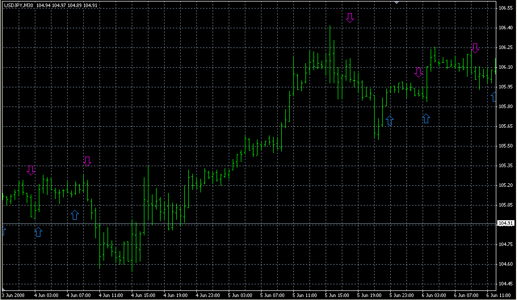 FXのフリーのチャートソフト、メタトレーダー4 (MT4)にインディケーターを表示させた画像です。