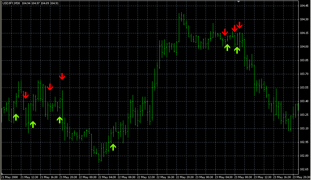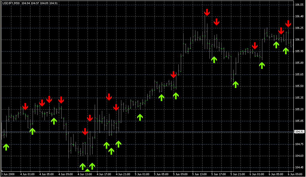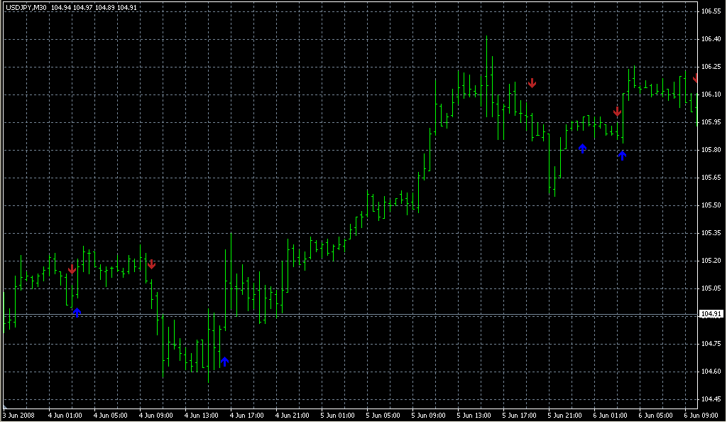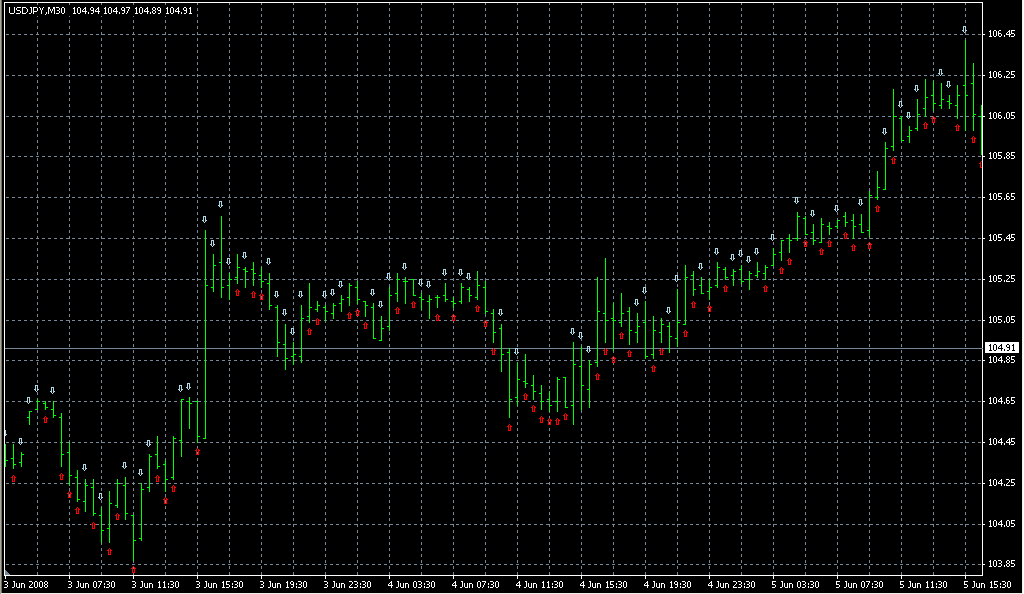 FXのフリーのチャートソフト、メタトレーダー4 (MT4)にインディケーターを表示させた画像です。