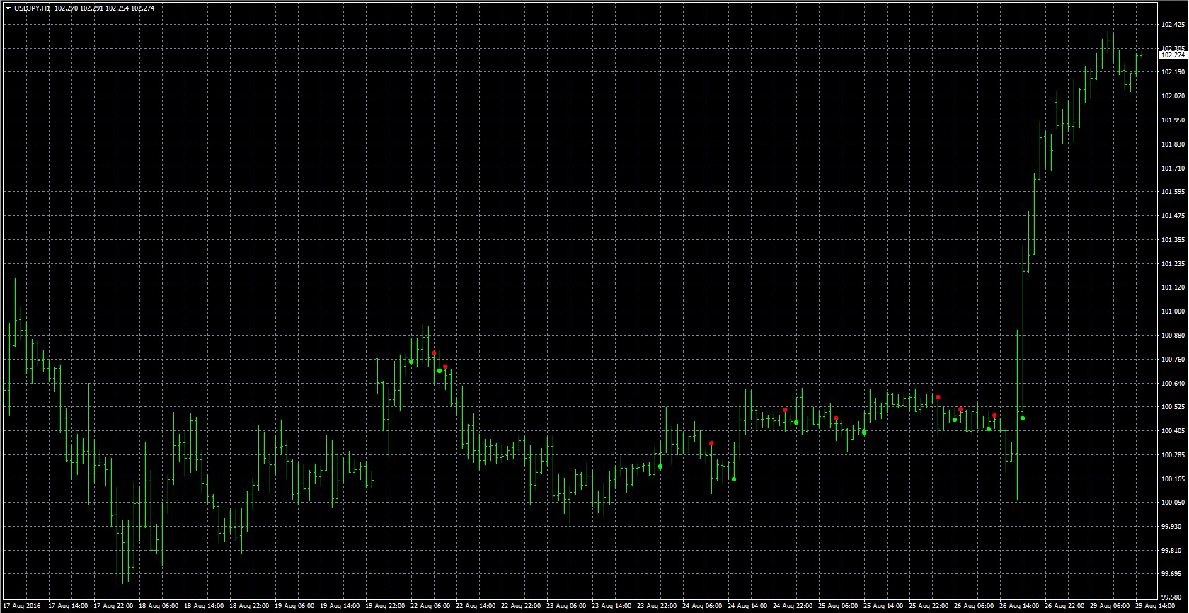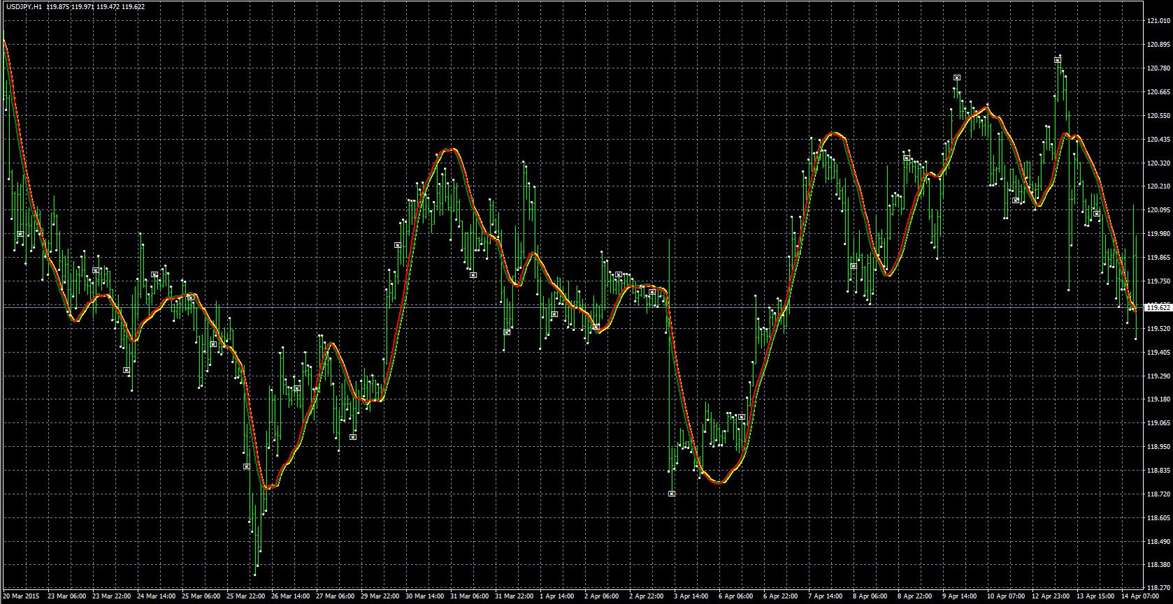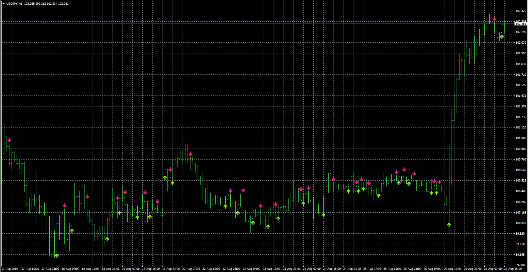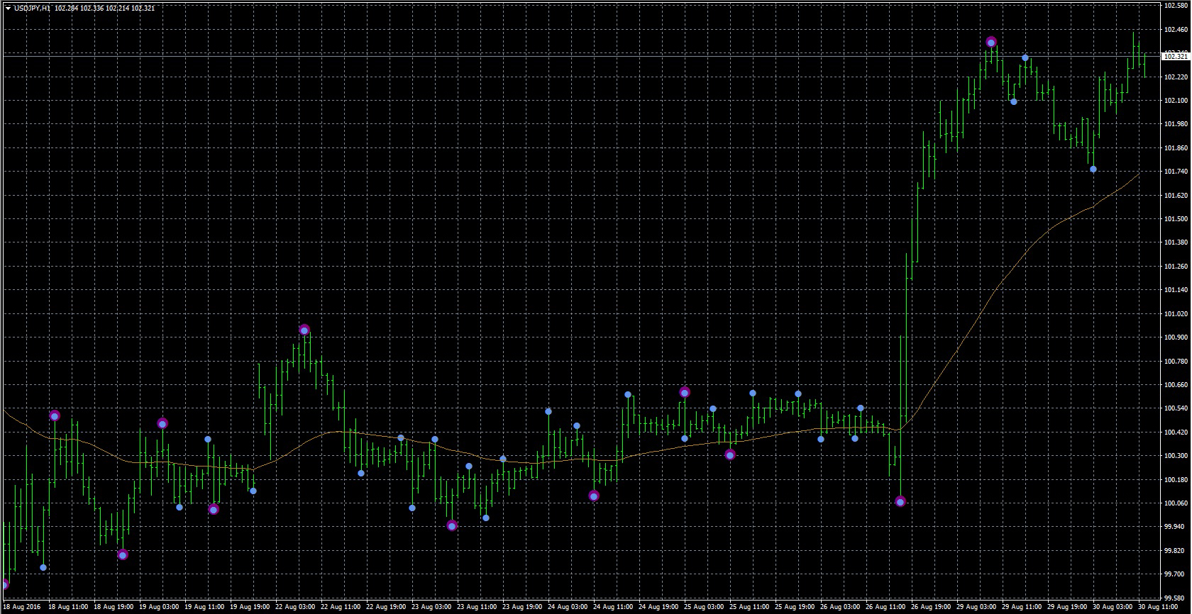 FXのフリーのチャートソフト、メタトレーダー4 (MT4)にインディケーターを表示させた画像です。