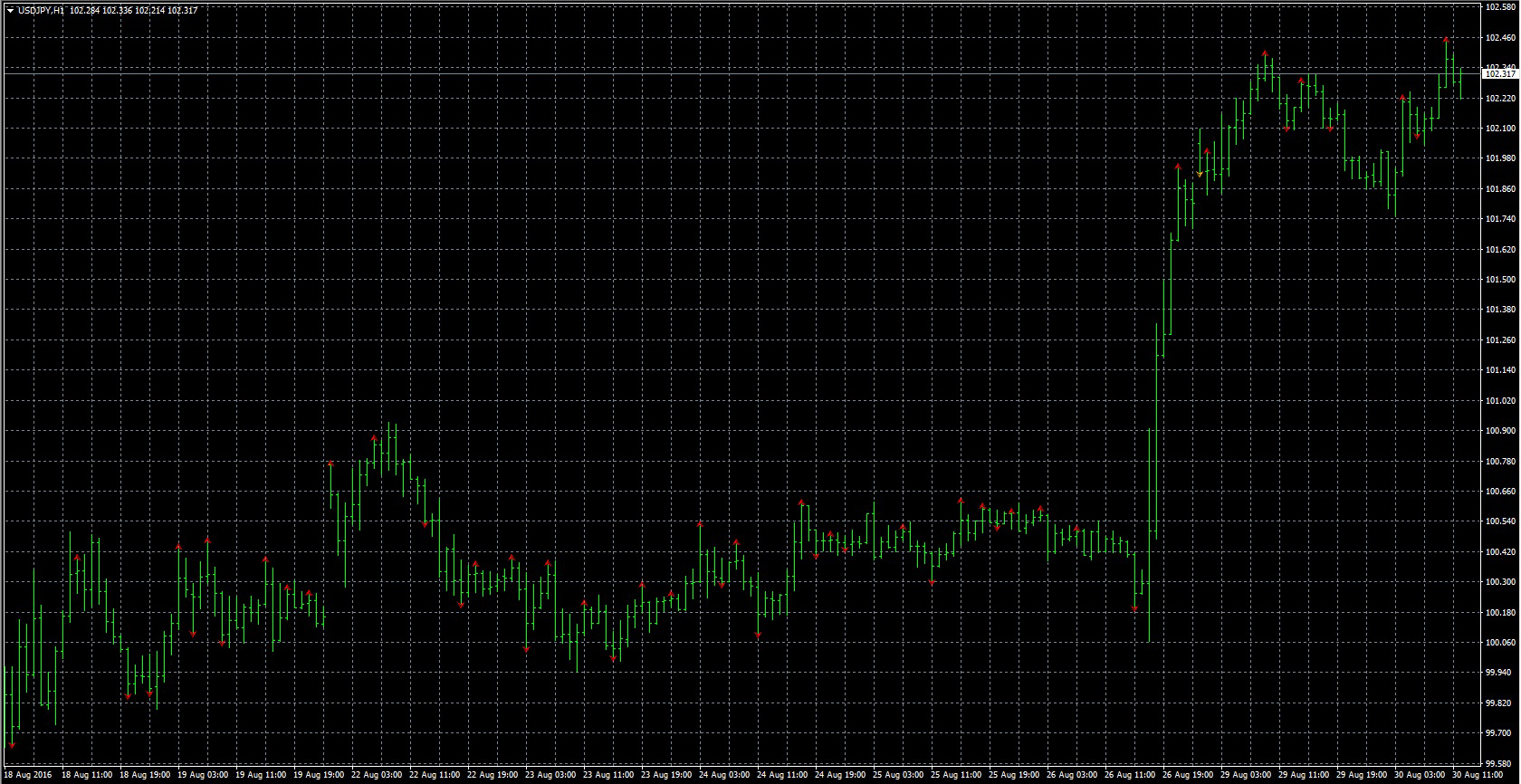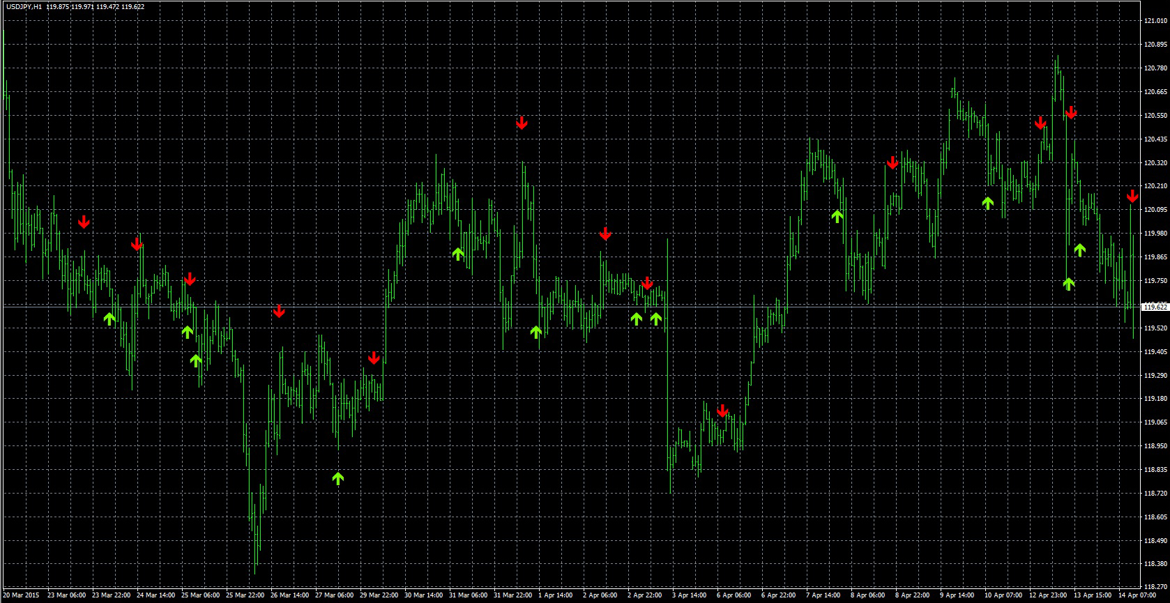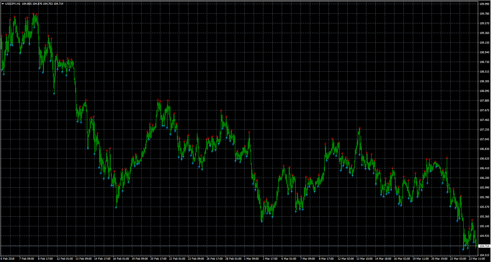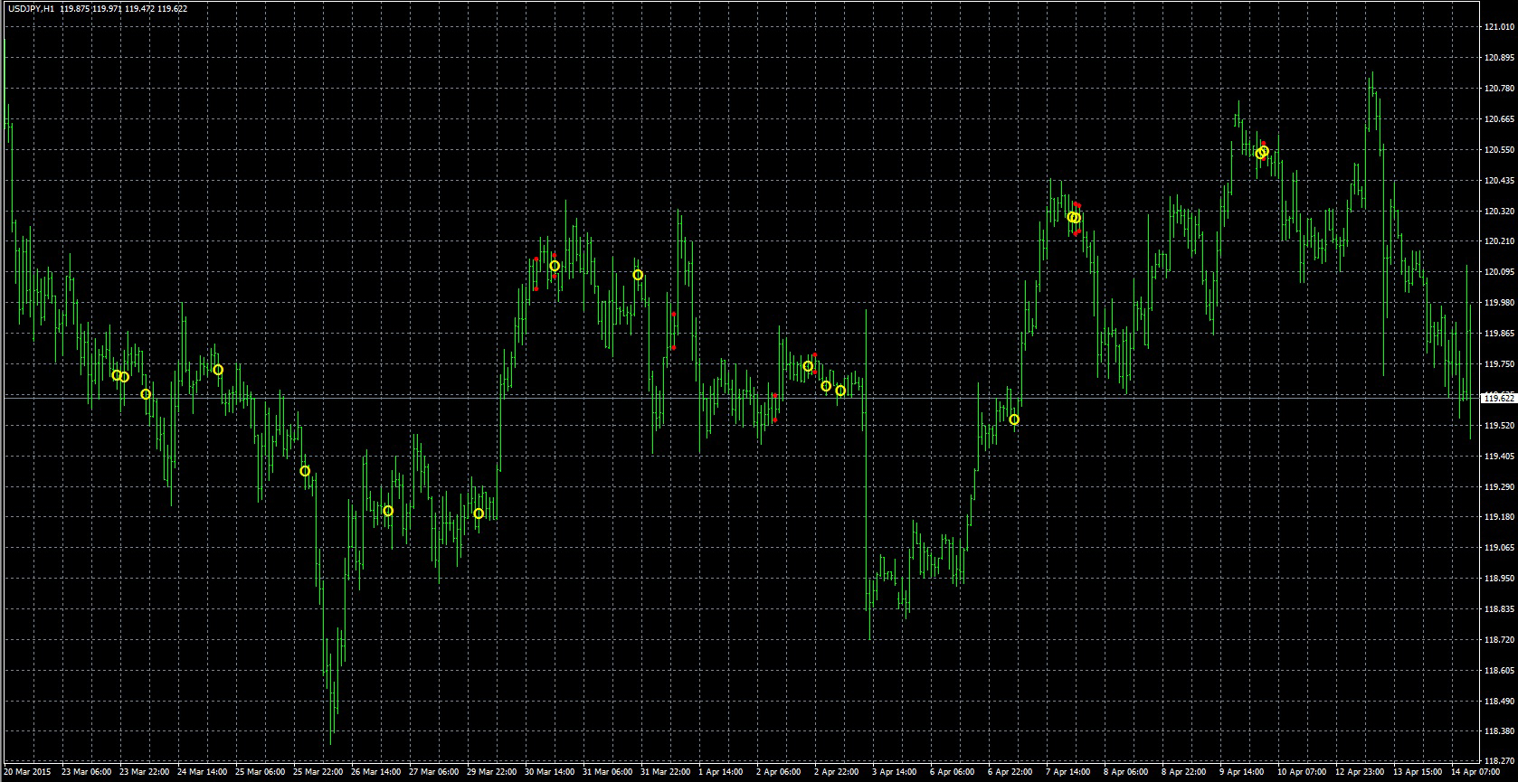 FXのフリーのチャートソフト、メタトレーダー4 (MT4)にインディケーターを表示させた画像です。
