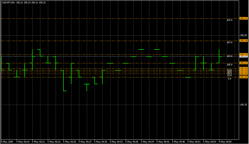 FXのフリーのチャートソフト、メタトレーダー4 (MT4)にインディケーターを表示させた画像です。