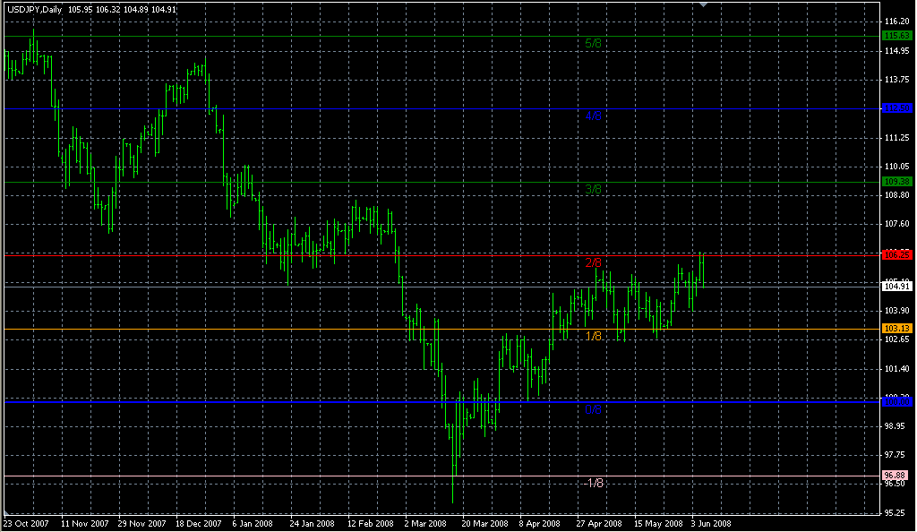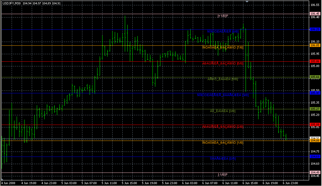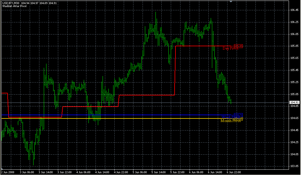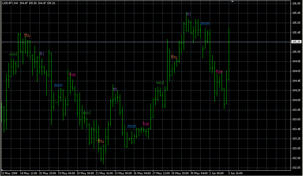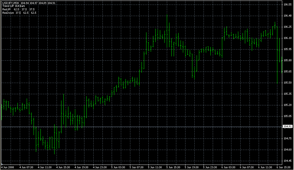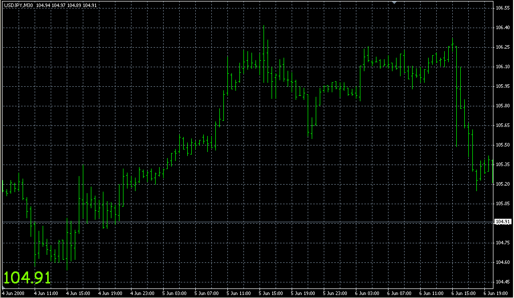 FXのフリーのチャートソフト、メタトレーダー4 (MT4)にインディケーターを表示させた画像です。
