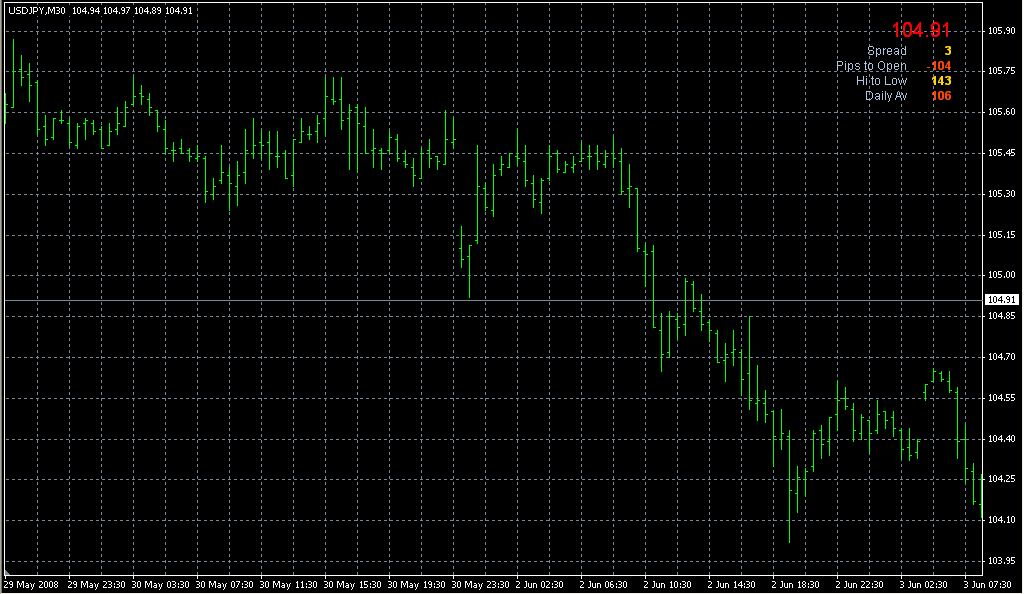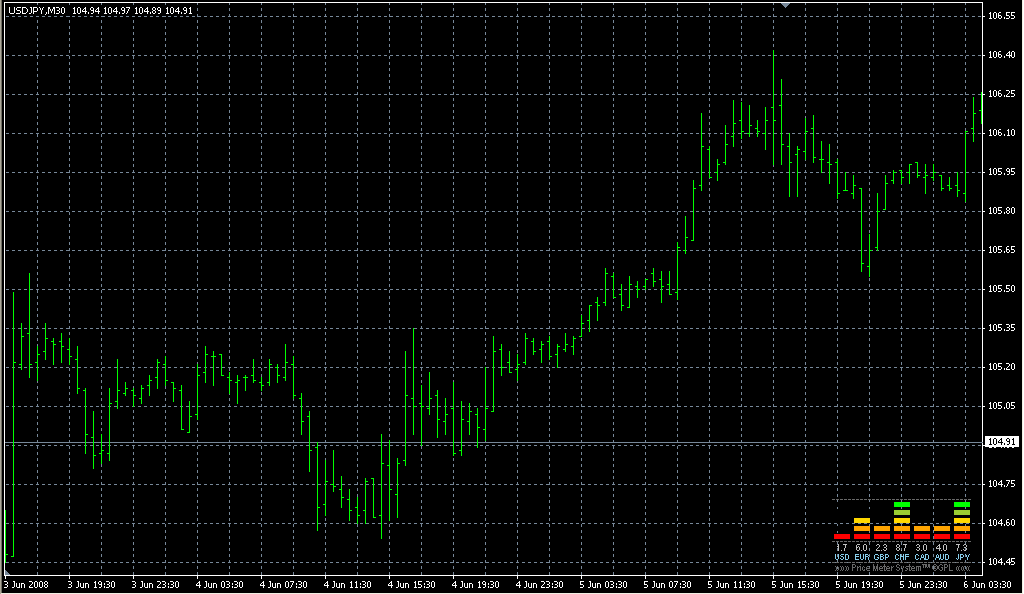 FXのフリーのチャートソフト、メタトレーダー4 (MT4)にインディケーターを表示させた画像です。