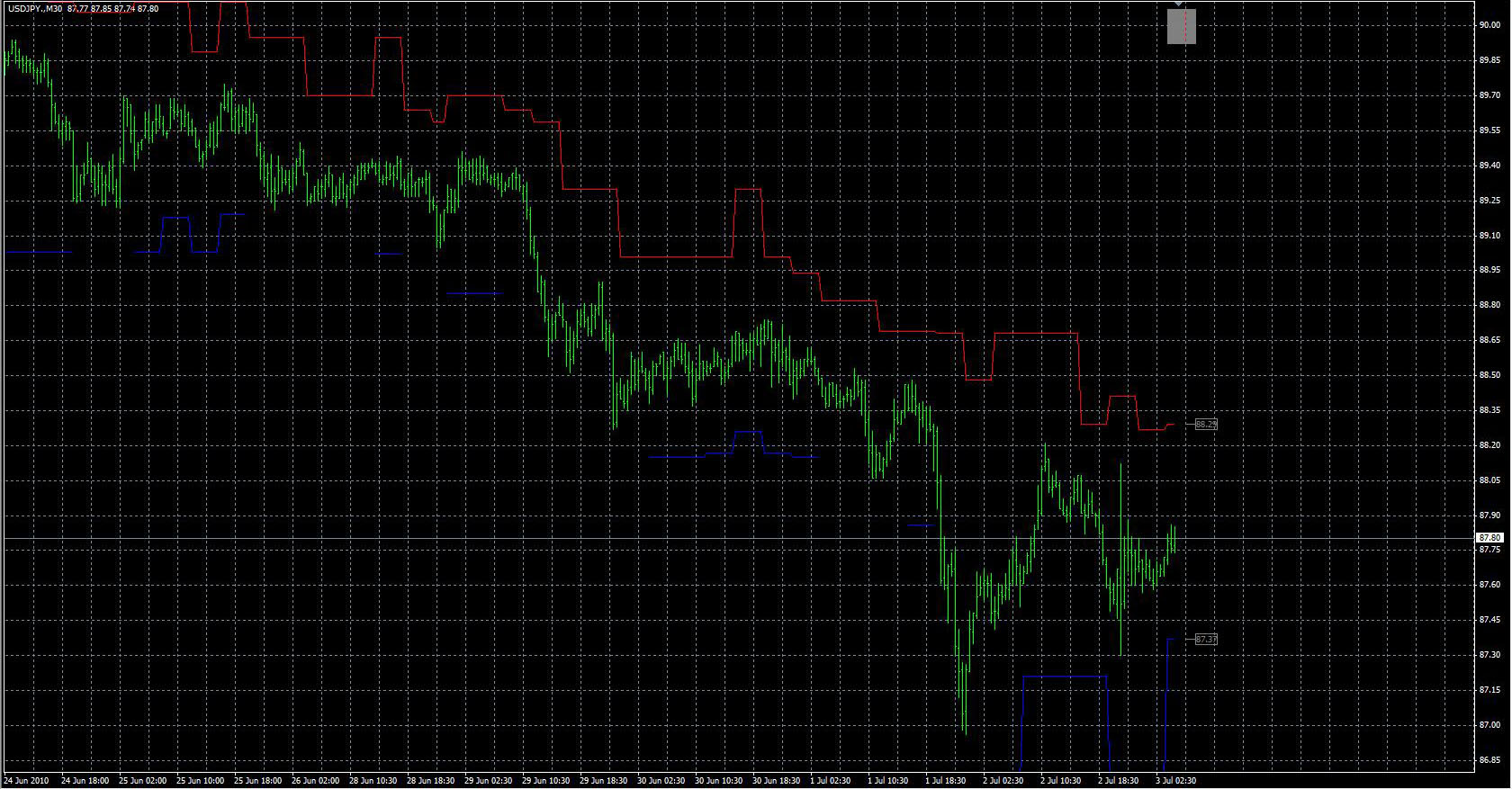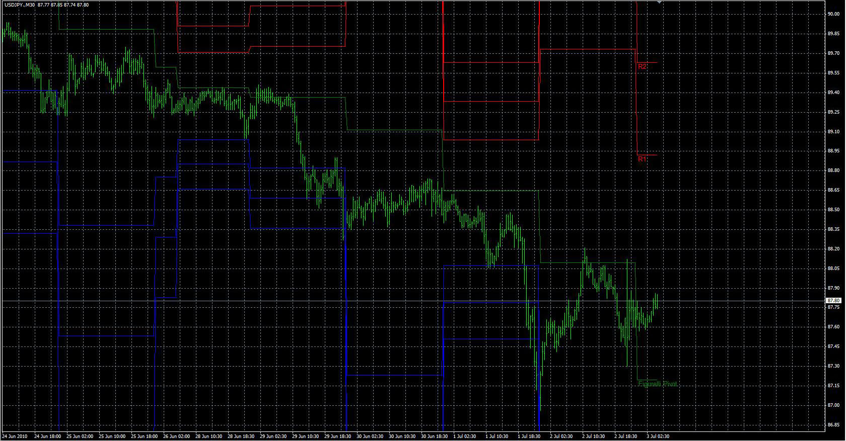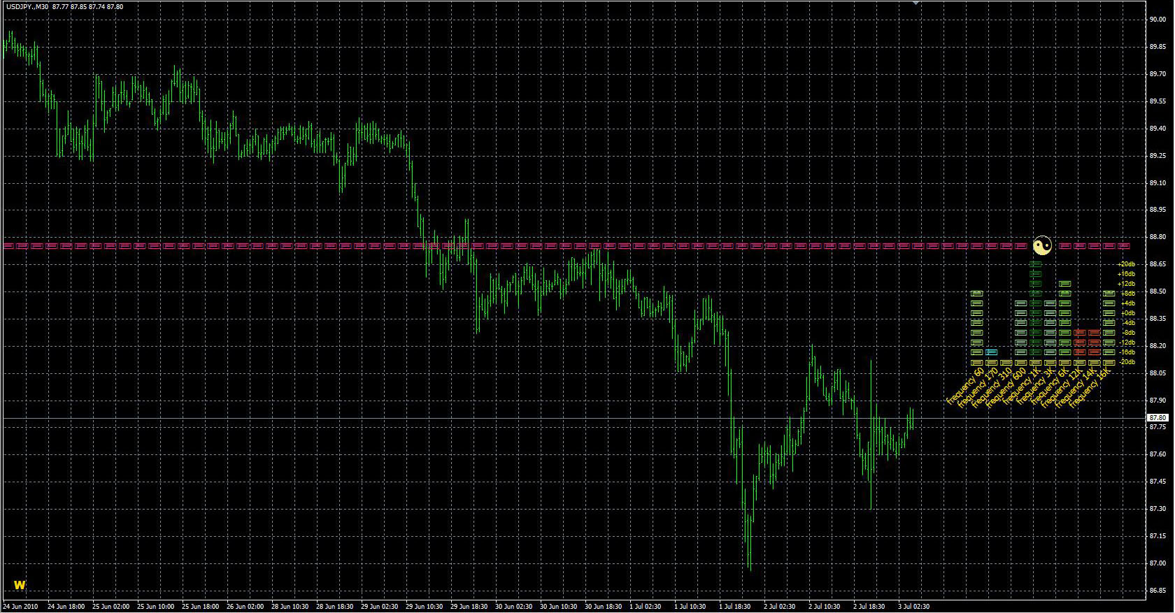 FXのフリーのチャートソフト、メタトレーダー4 (MT4)にインディケーターを表示させた画像です。