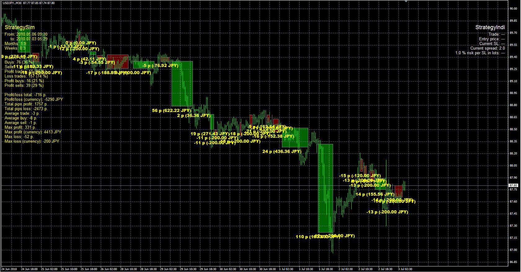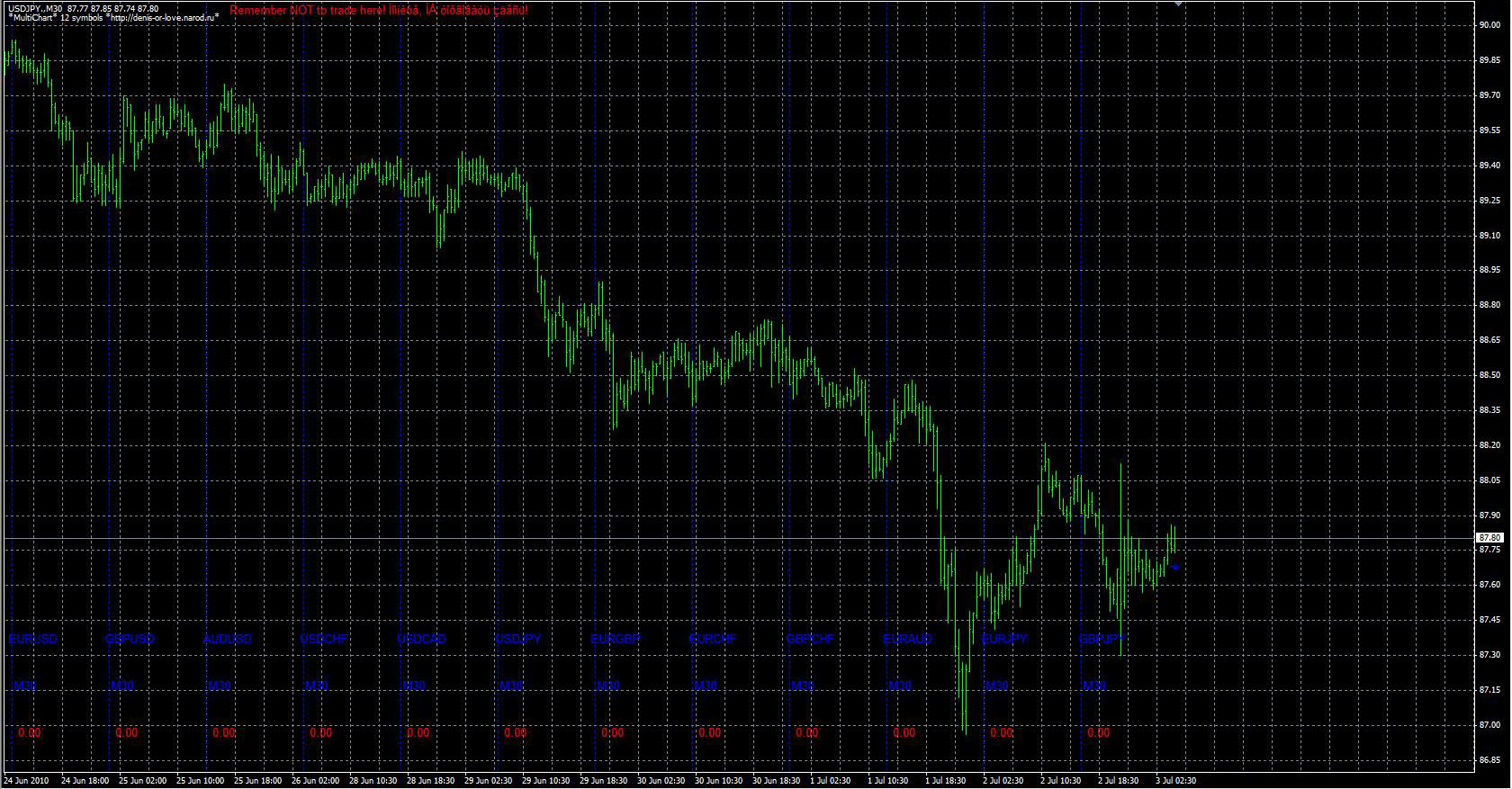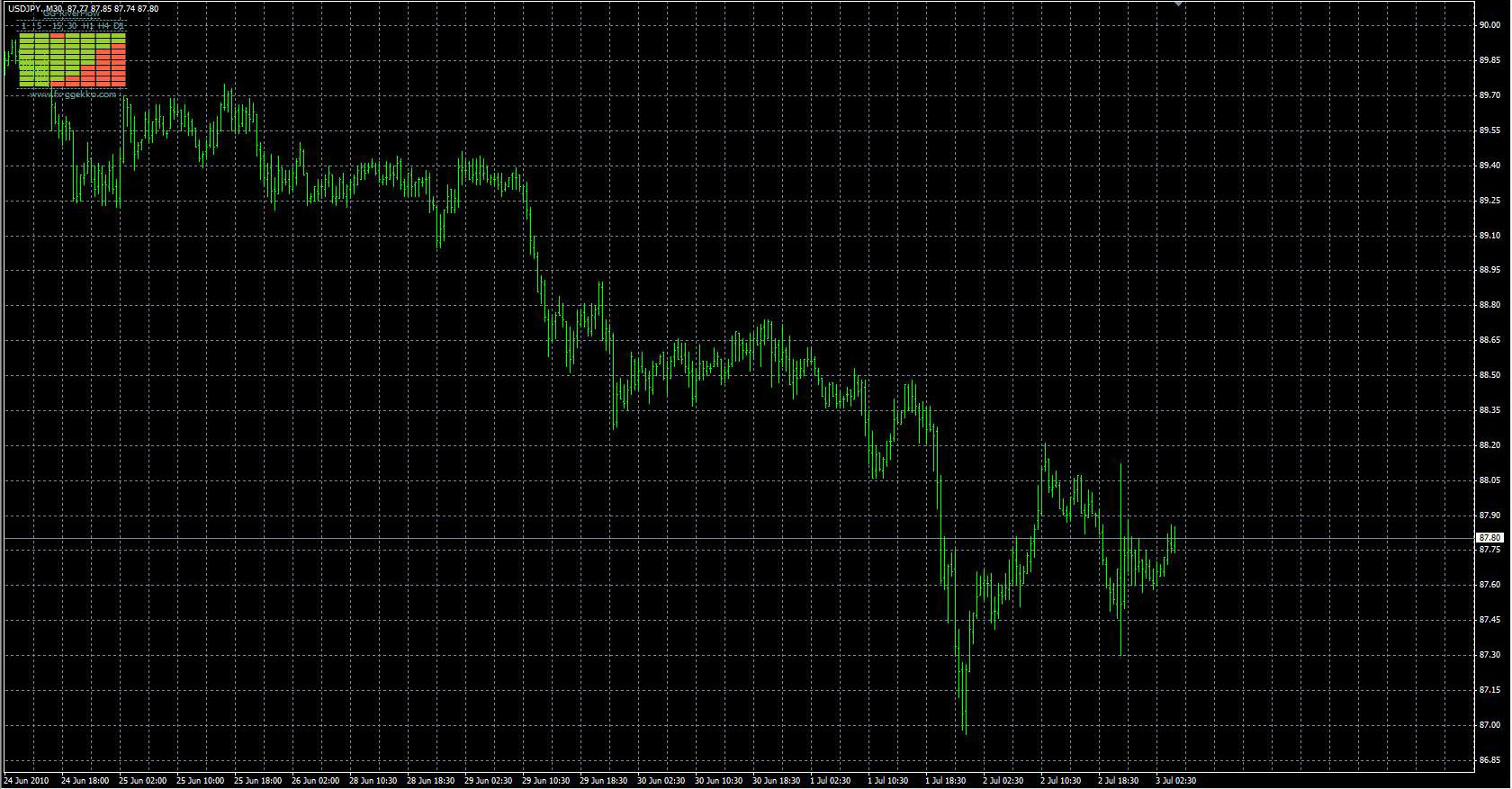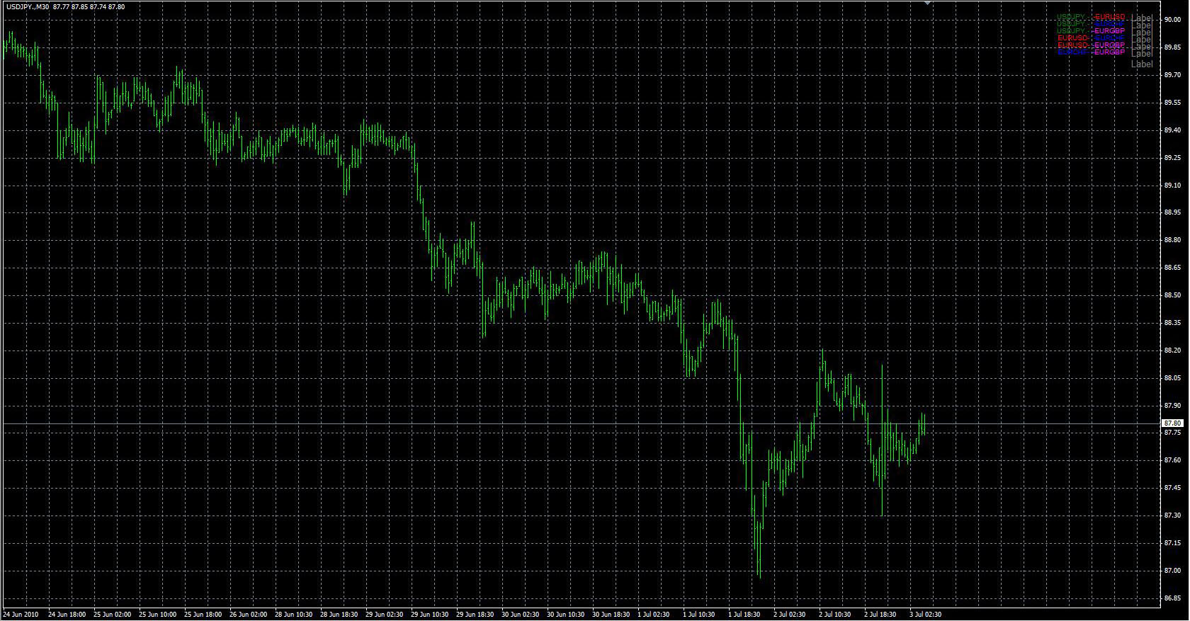 FXのフリーのチャートソフト、メタトレーダー4 (MT4)にインディケーターを表示させた画像です。