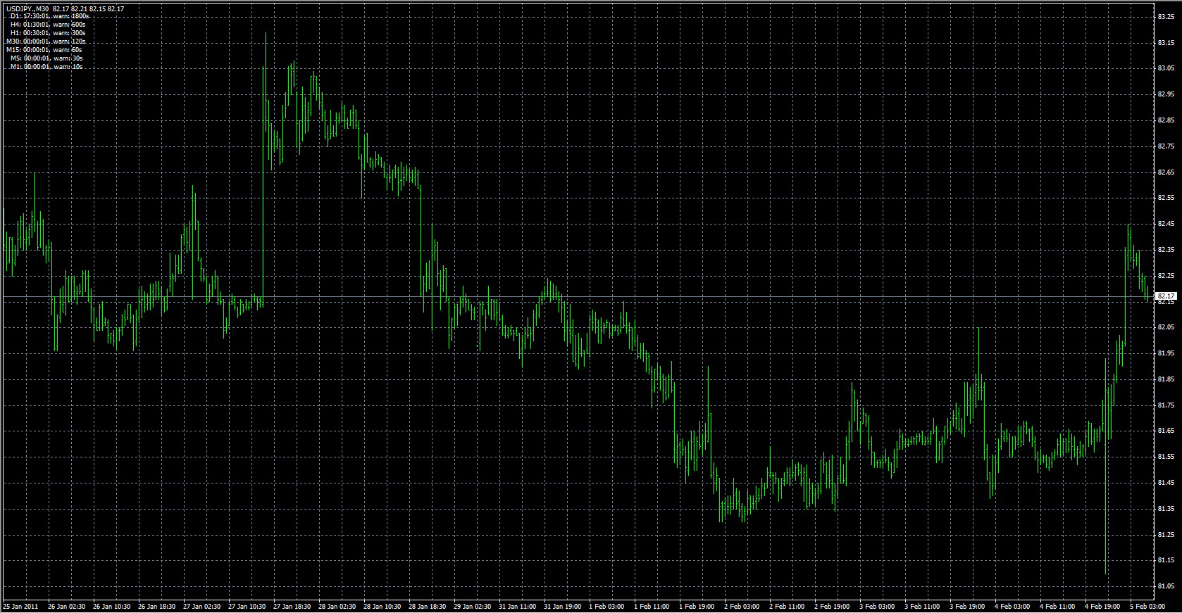 FXのフリーのチャートソフト、メタトレーダー4 (MT4)にインディケーターを表示させた画像です。