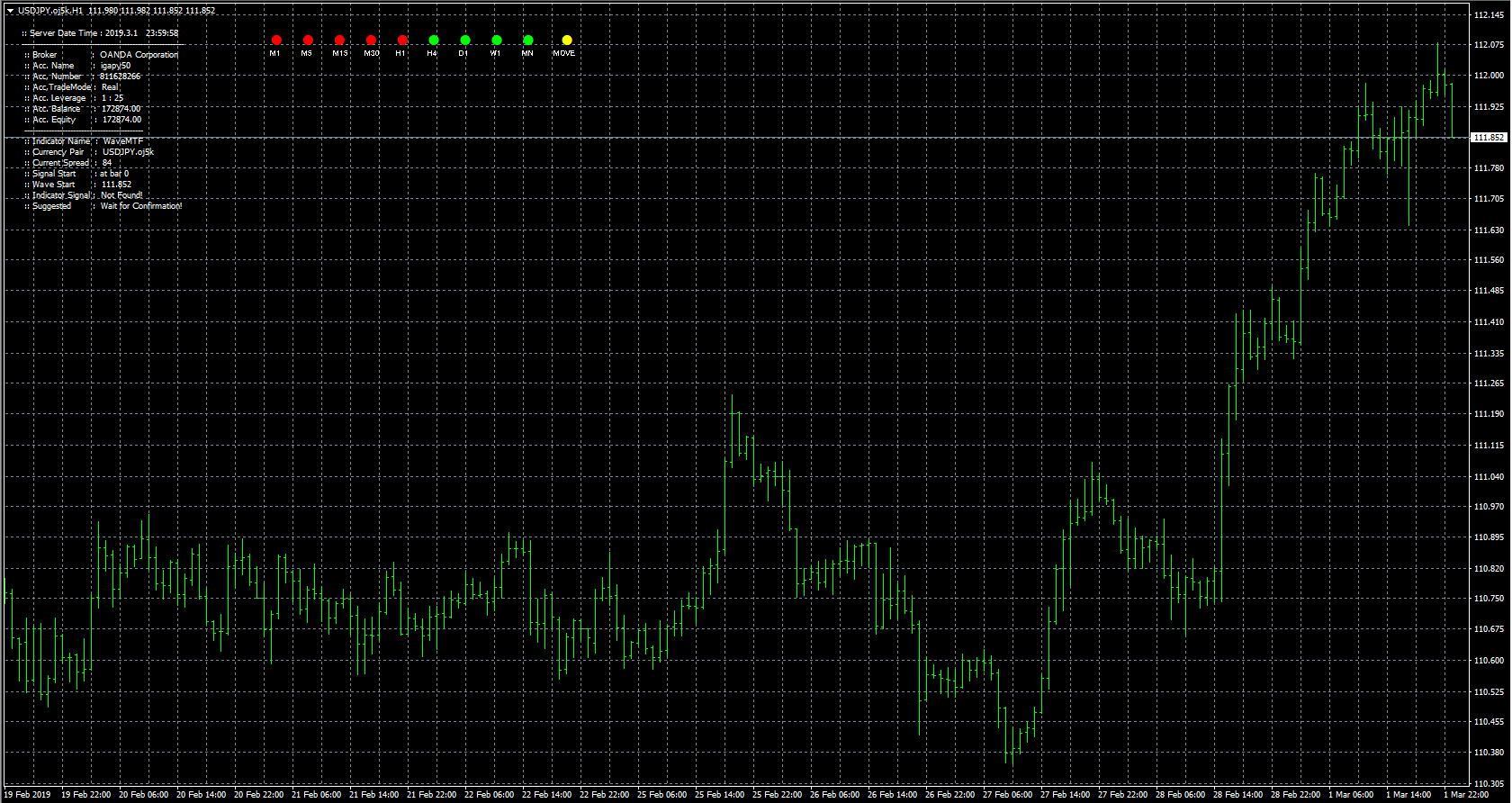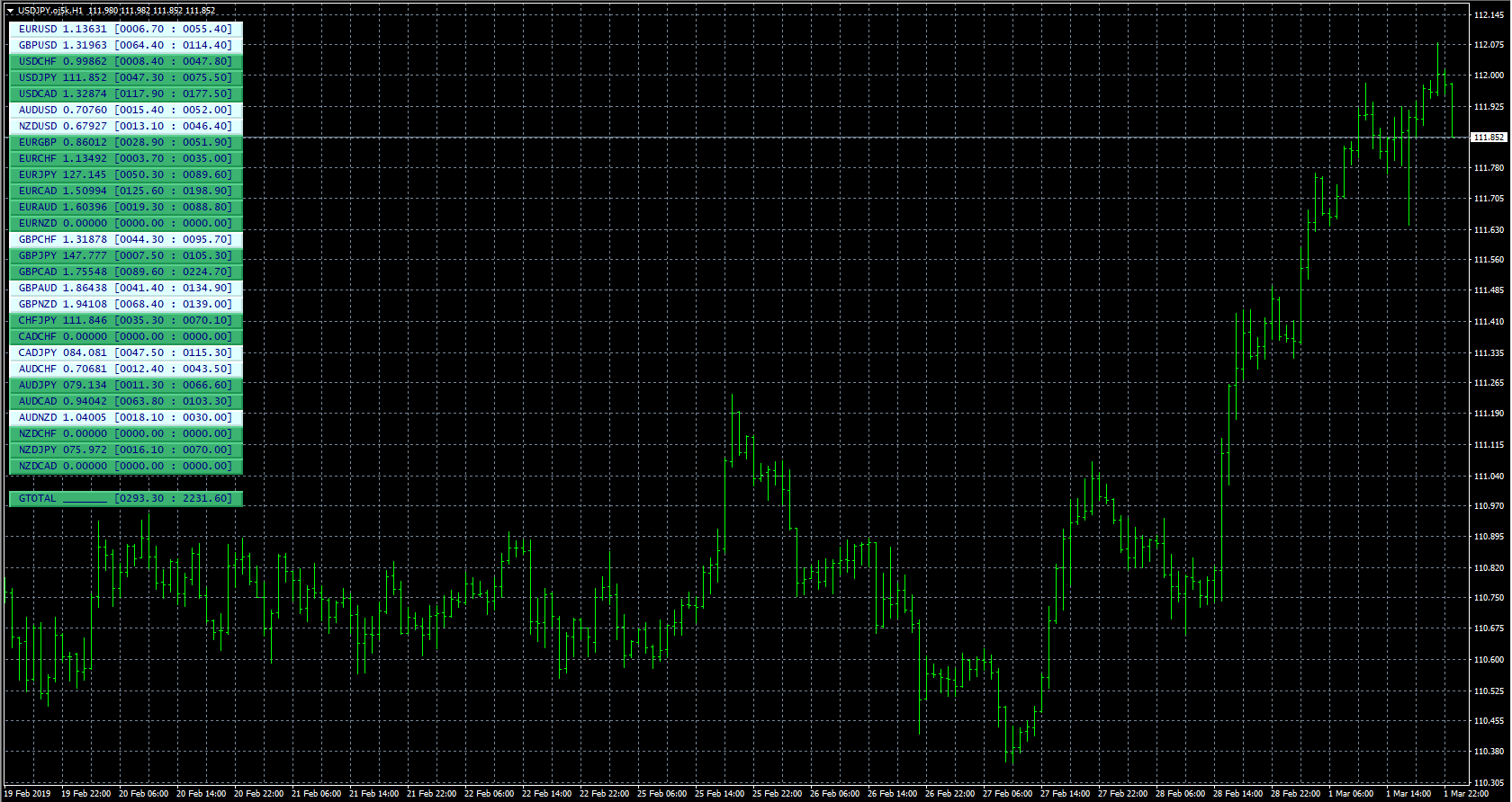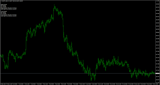 FXのフリーのチャートソフト、メタトレーダー4 (MT4)にインディケーターを表示させた画像です。