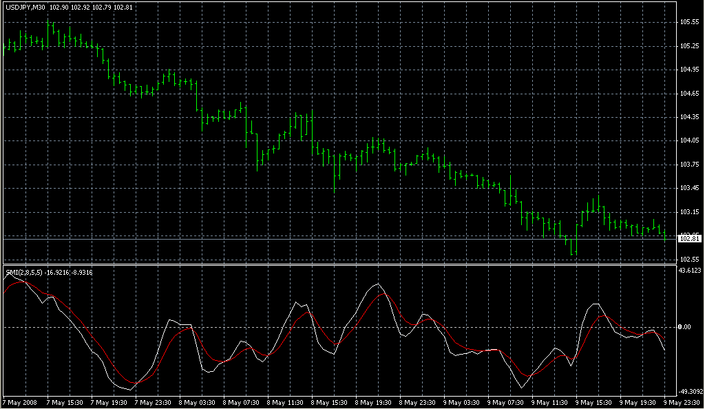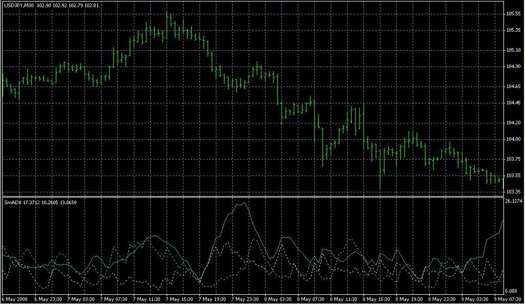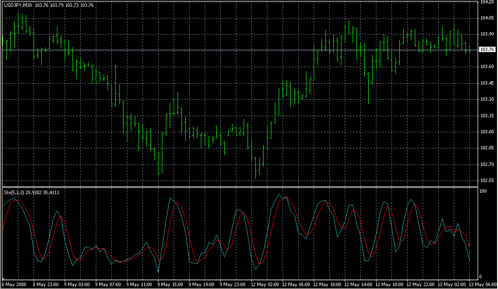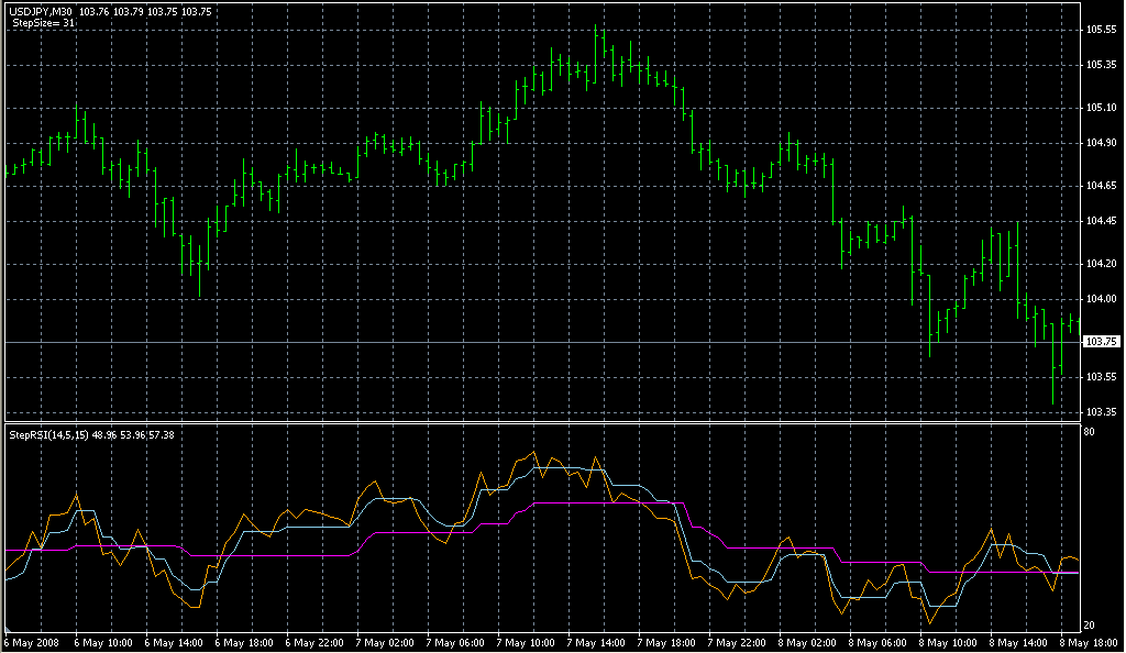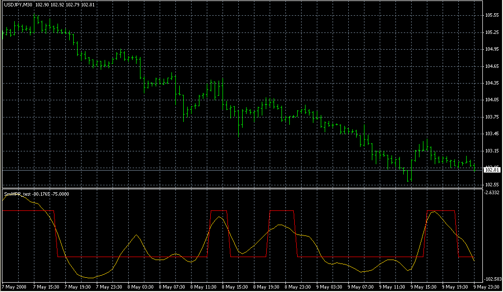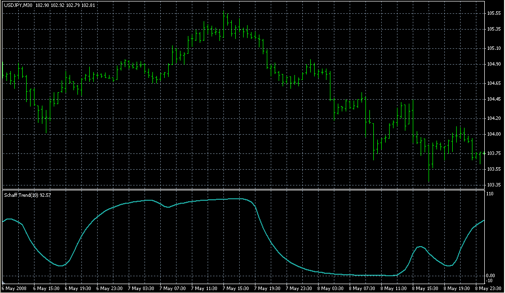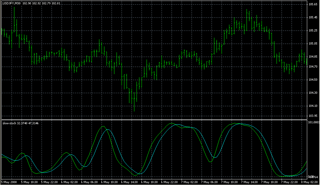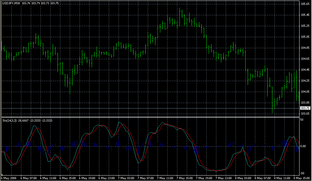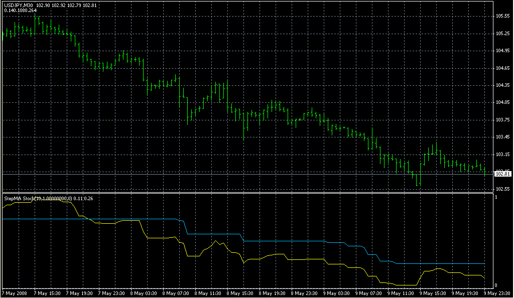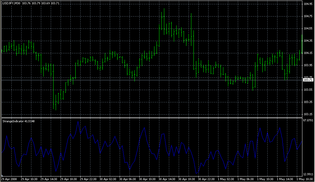 FXのフリーのチャートソフト、メタトレーダー4 (MT4)にインディケーターを表示させた画像です。