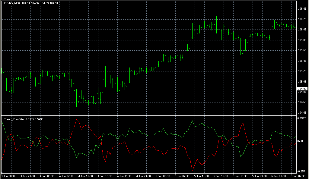 FXのフリーのチャートソフト、メタトレーダー4 (MT4)にインディケーターを表示させた画像です。