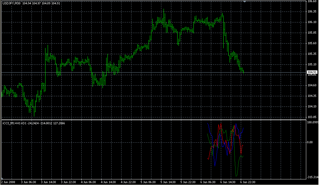 FXのフリーのチャートソフト、メタトレーダー4 (MT4)にインディケーターを表示させた画像です。