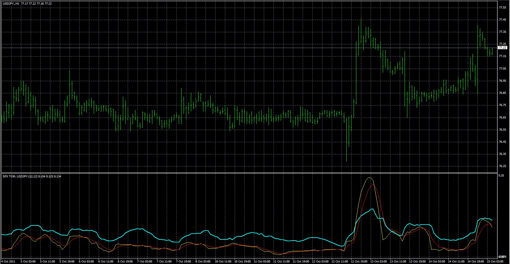 FXのフリーのチャートソフト、メタトレーダー4 (MT4)にインディケーターを表示させた画像です。