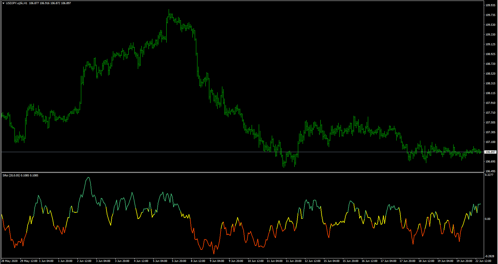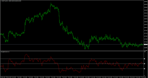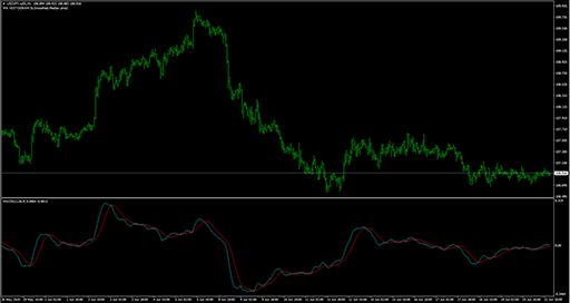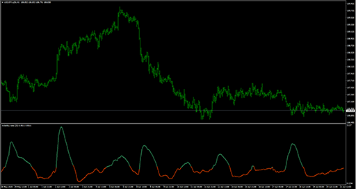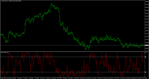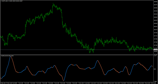 FXのフリーのチャートソフト、メタトレーダー4 (MT4)にインディケーターを表示させた画像です。