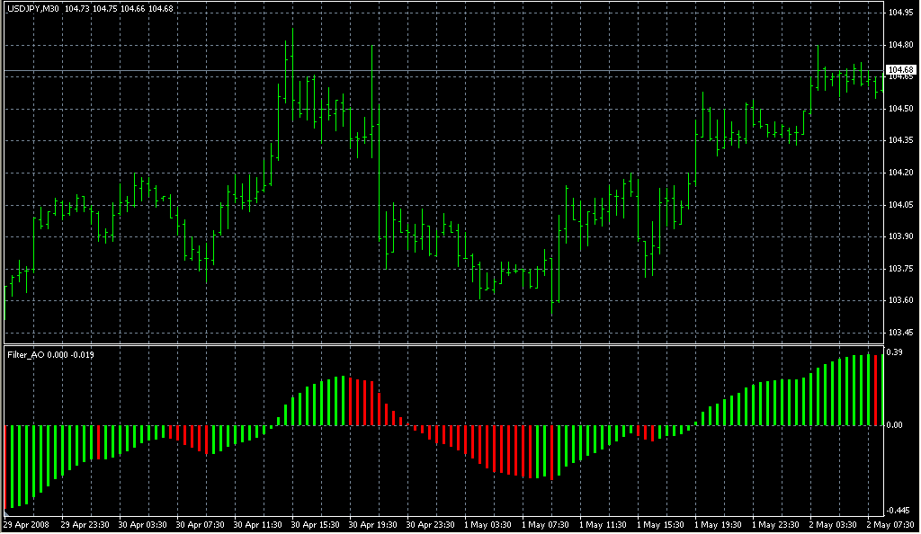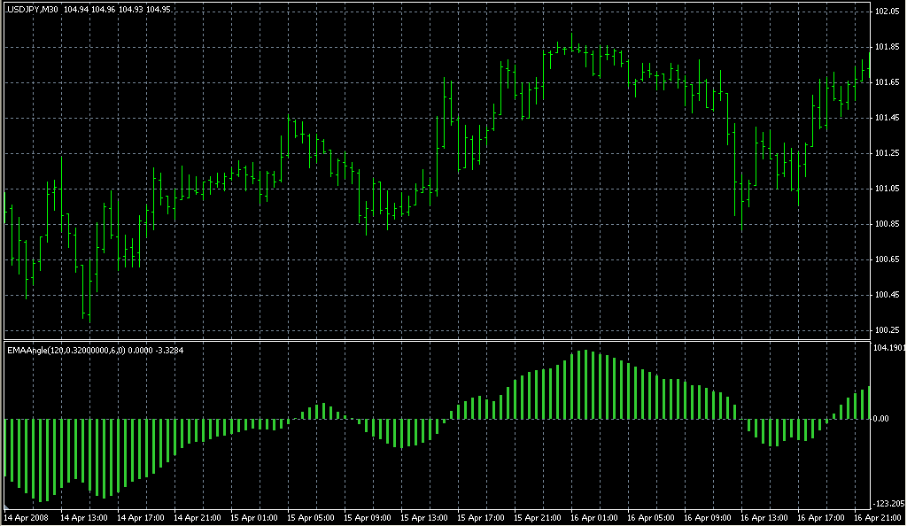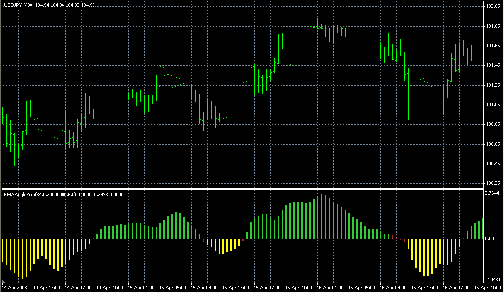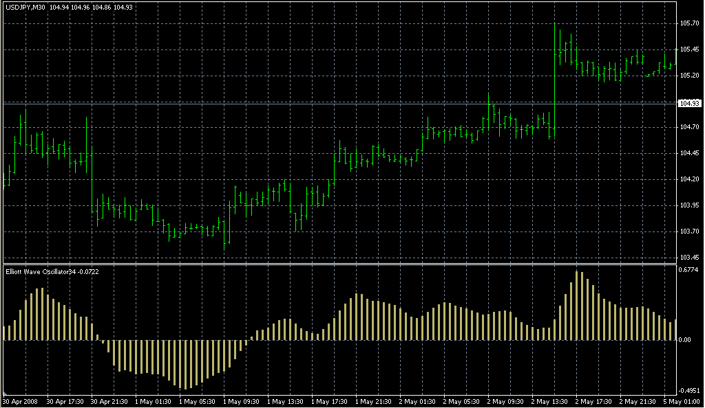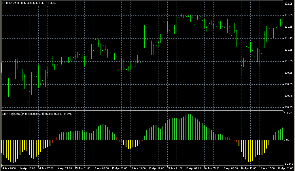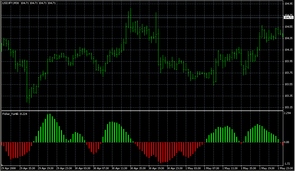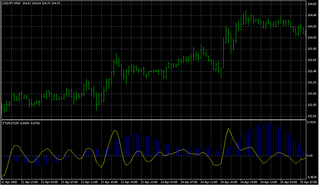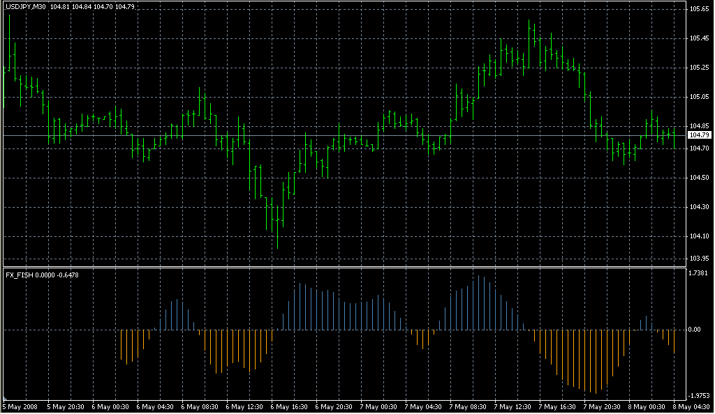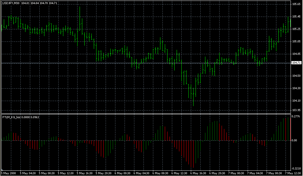 FXのフリーのチャートソフト、メタトレーダー4 (MT4)にインディケーターを表示させた画像です。