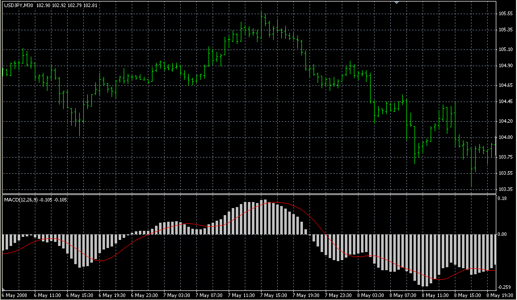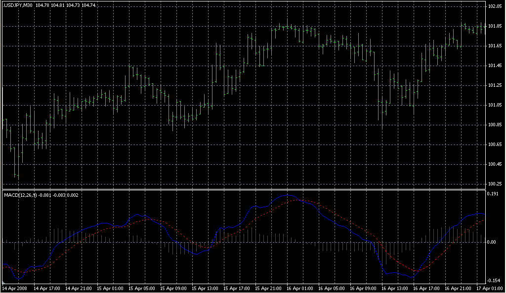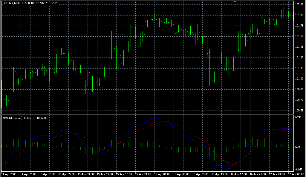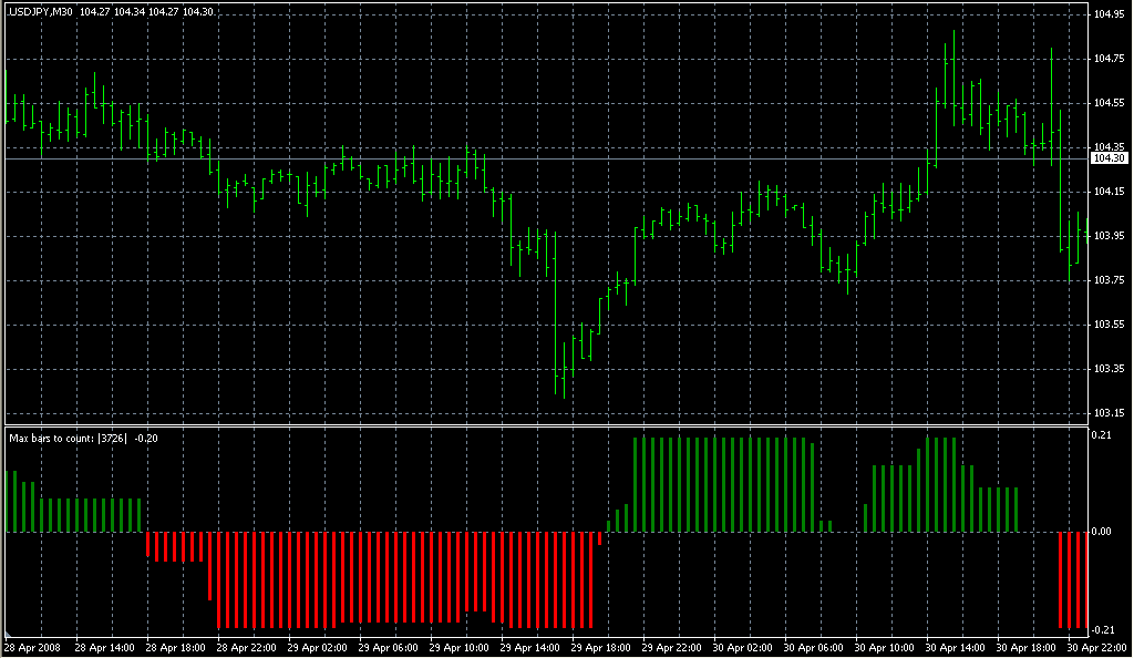 FXのフリーのチャートソフト、メタトレーダー4 (MT4)にインディケーターを表示させた画像です。
