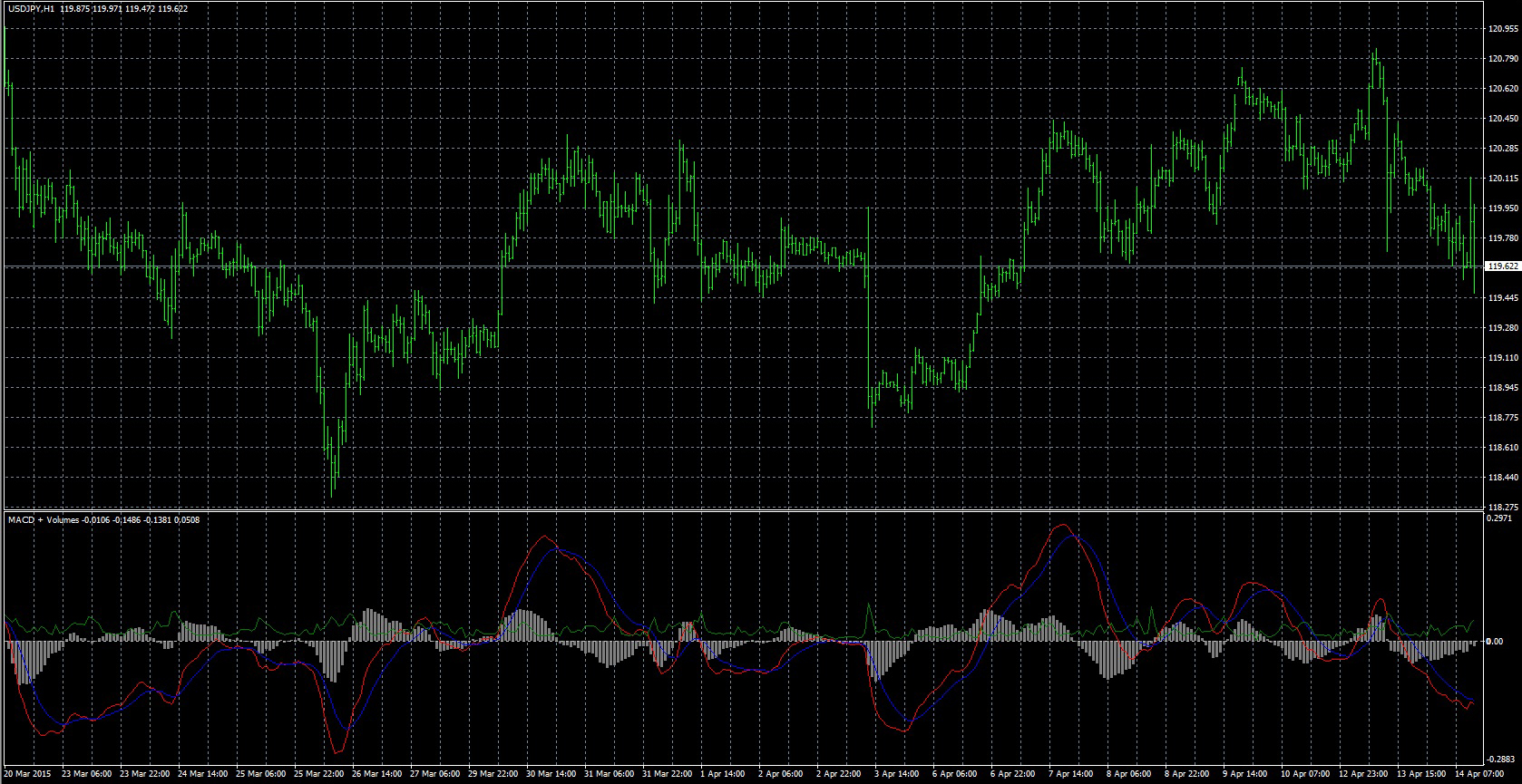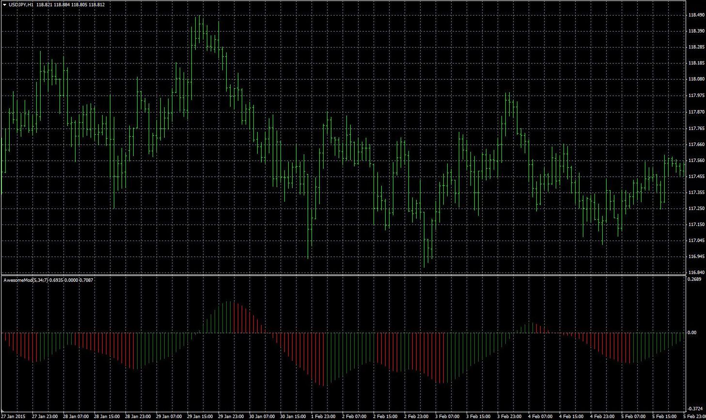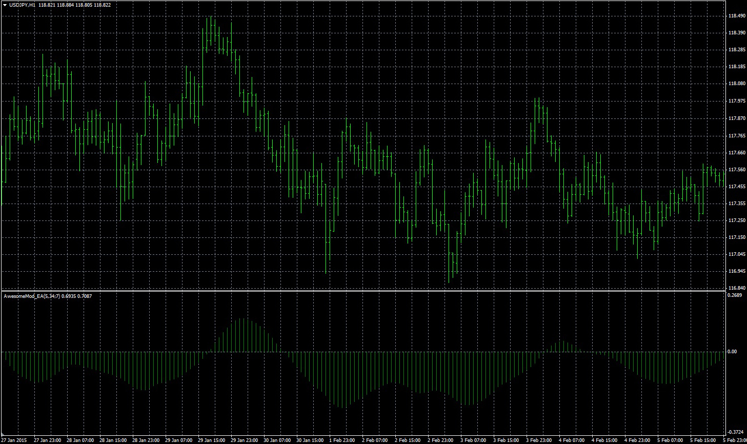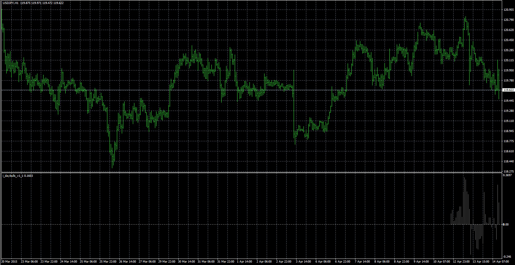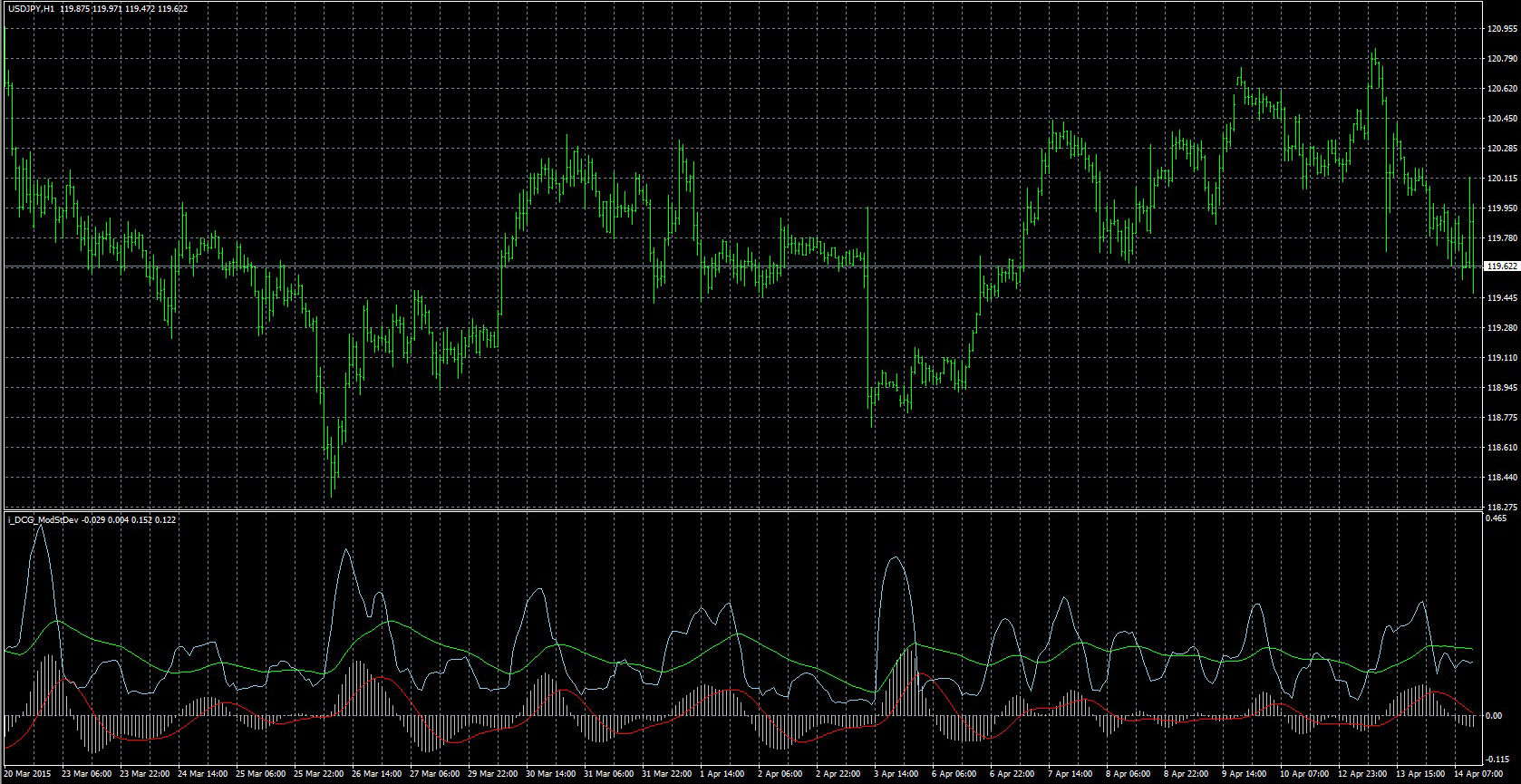 FXのフリーのチャートソフト、メタトレーダー4 (MT4)にインディケーターを表示させた画像です。