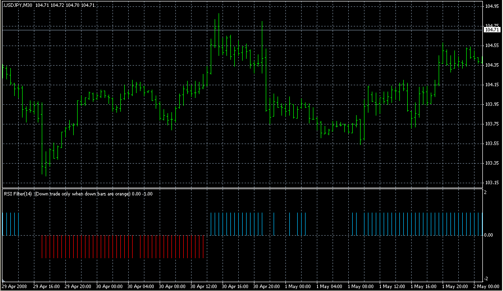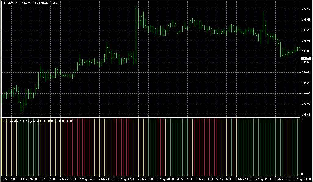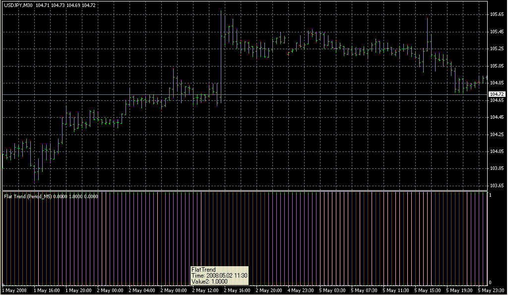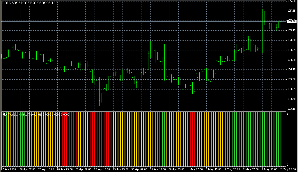 FXのフリーのチャートソフト、メタトレーダー4 (MT4)にインディケーターを表示させた画像です。