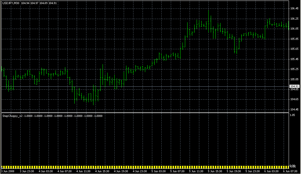 FXのフリーのチャートソフト、メタトレーダー4 (MT4)にインディケーターを表示させた画像です。