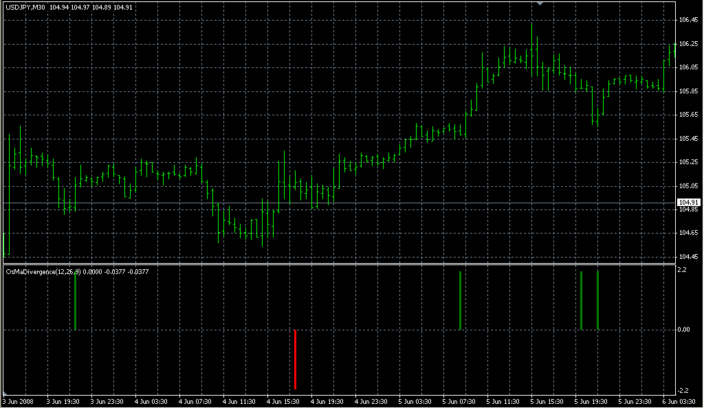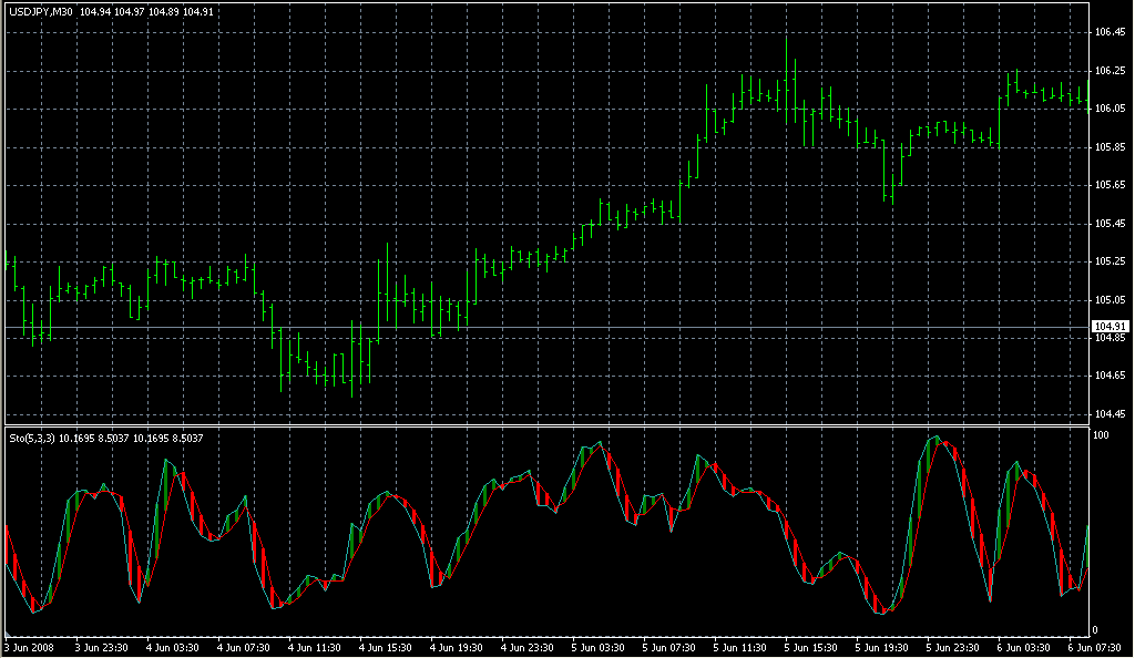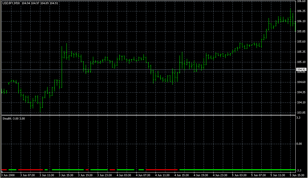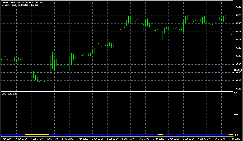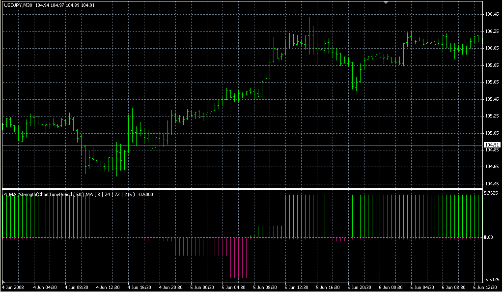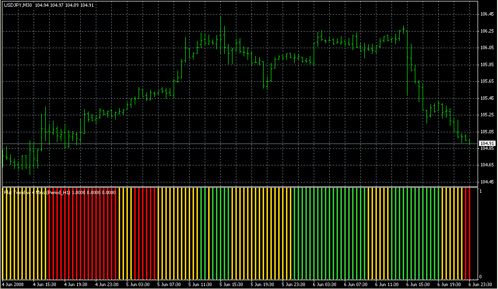 FXのフリーのチャートソフト、メタトレーダー4 (MT4)にインディケーターを表示させた画像です。