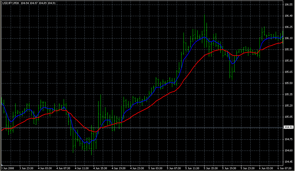 オシレータ系RSIとRSIの値を平均したもので、線がクロスしたポイントが売買シグナルとなります。