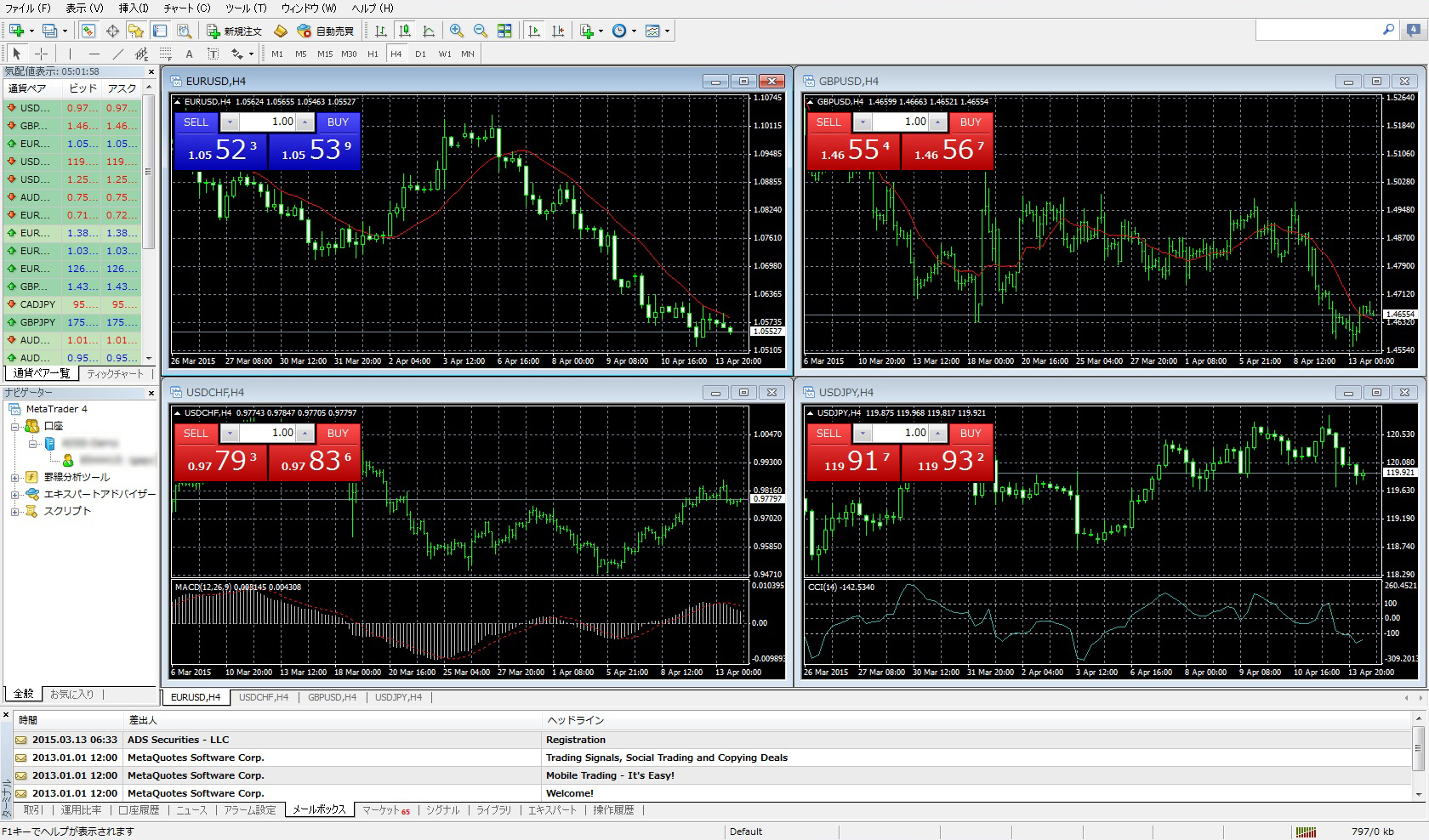 メタトレーダー4(MetaTrader4:通称MT4)とは、MetaQuotes Software社が開発した、フリーのチャートソフトです。