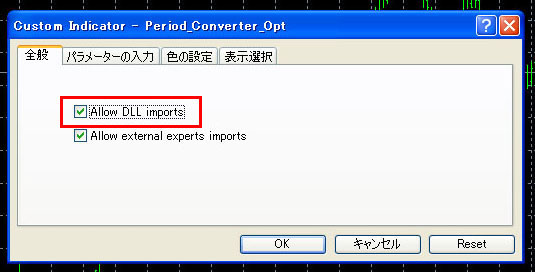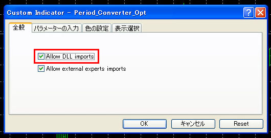 インディケーターの設定画面が出ますので、「全般」タブのAllow DLL importsにチェックを入れてください。