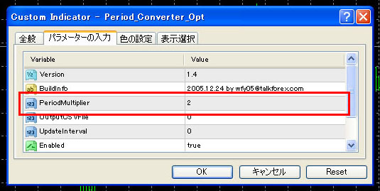 「パラメーターの入力」タブで、PeriodMultiplierの項が「2」となっているのを確認してください。