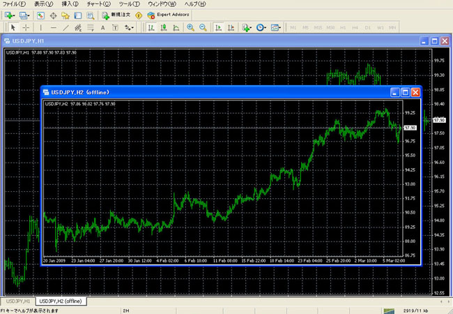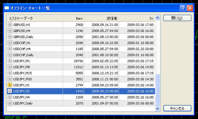 「オフライン・チャート一覧」が出ますので、そこからUSDJPY,H2を選んで「開く」をクリックします。