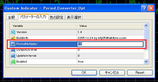「パラメーターの入力」タブで、PeriodMultiplierの項に「10」と入力してください。