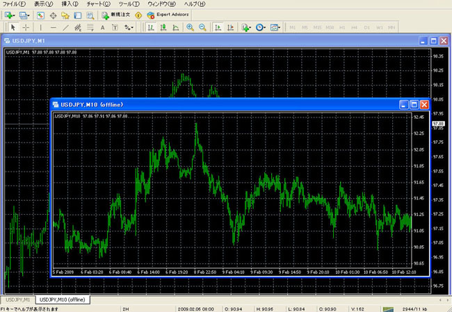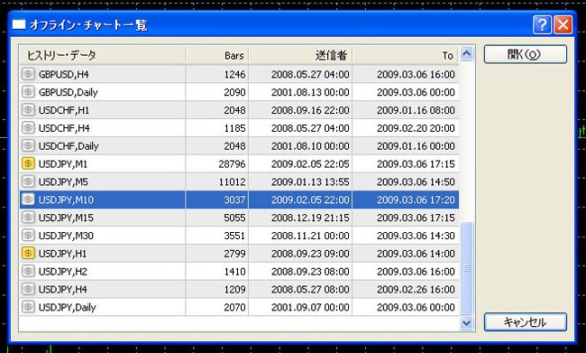 「オフライン・チャート一覧」が出ますので、そこからUSDJPY,M10を選んで「開く」をクリックします。
