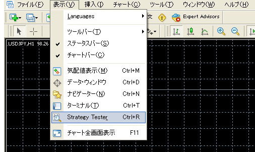 プルダウンメニューの「表示」→「strategy tester」を選びます。