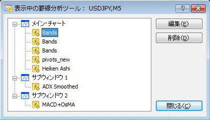 表示中の罫線分析ツール 現在チャート上に表示されているインディケーター一覧の表示