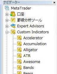 「罫線分析ツール」もしくは「Custom Indicators」の前にある+をクリックして メタトレーダー4にインストールしてあるインディケーター一覧を表示させます。