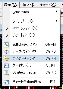 プルダウンメニュー→表示→ナビゲーターで、ナビゲーターウィンドウを開きます。