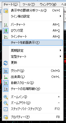 ①プルダウンメニュー→チャート→チャートを前面表示を選ぶ。