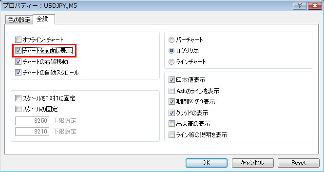 ②チャート上で右クリック→プロパティー→全般タブ→チャートを前面に表示にチェックを入れる。
