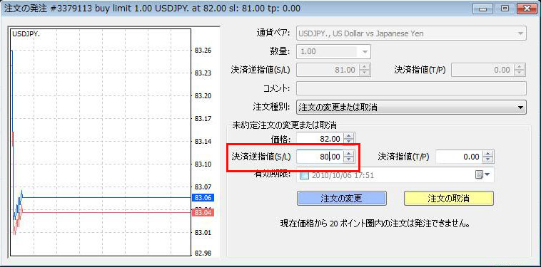 決済逆指値(S/L)の数字を変更し、「注文の変更」ボタンをクリックして変更完了です。