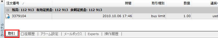 プルダウンメニュー→表示→ターミナル、もしくは「Ctrl」+「T」で、ターミナルウィンドウを開き「取引」タブを選択します。