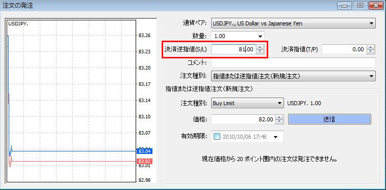 「注文の発注」ウィンドウを開きます。 「数量」の下にある「決済逆指値(S/L)」にプライスを入れて指定します。