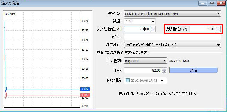 ちなみに、その横の「決済指値(T/P)」は、指値での決済(利食い決済)のときにプライスを入力します。