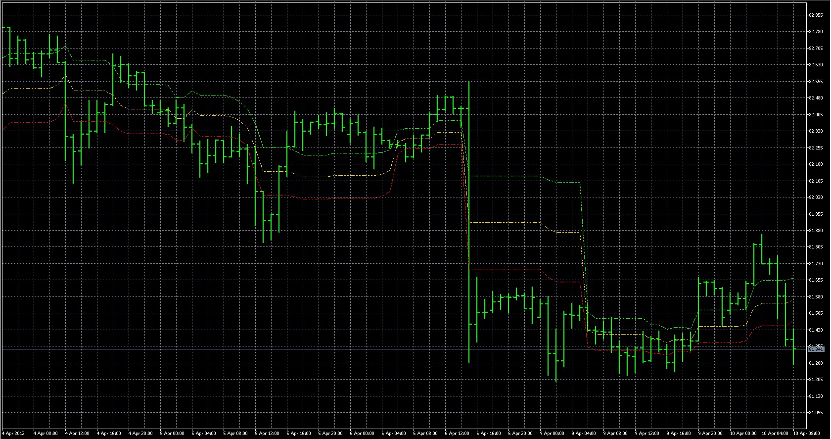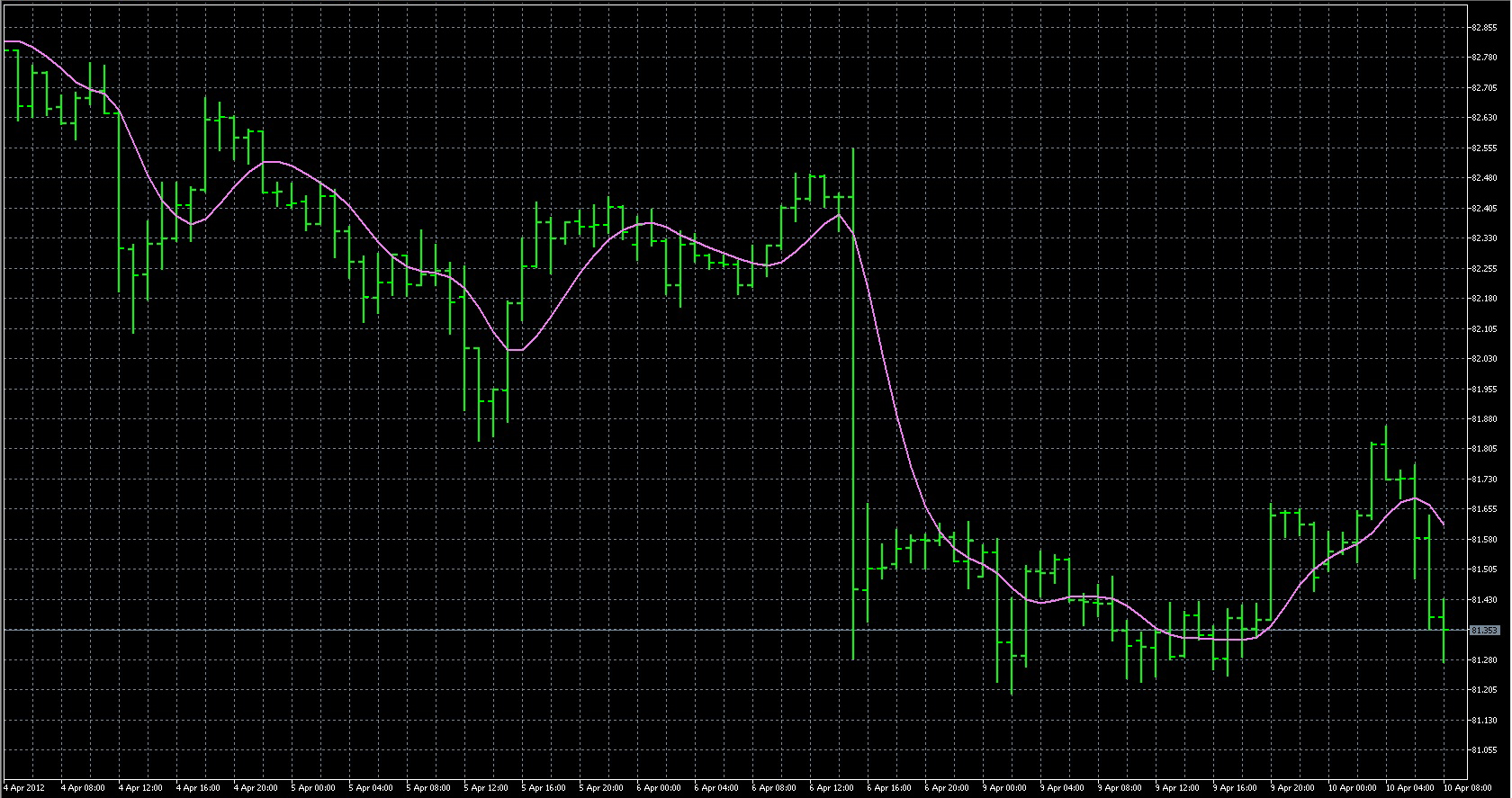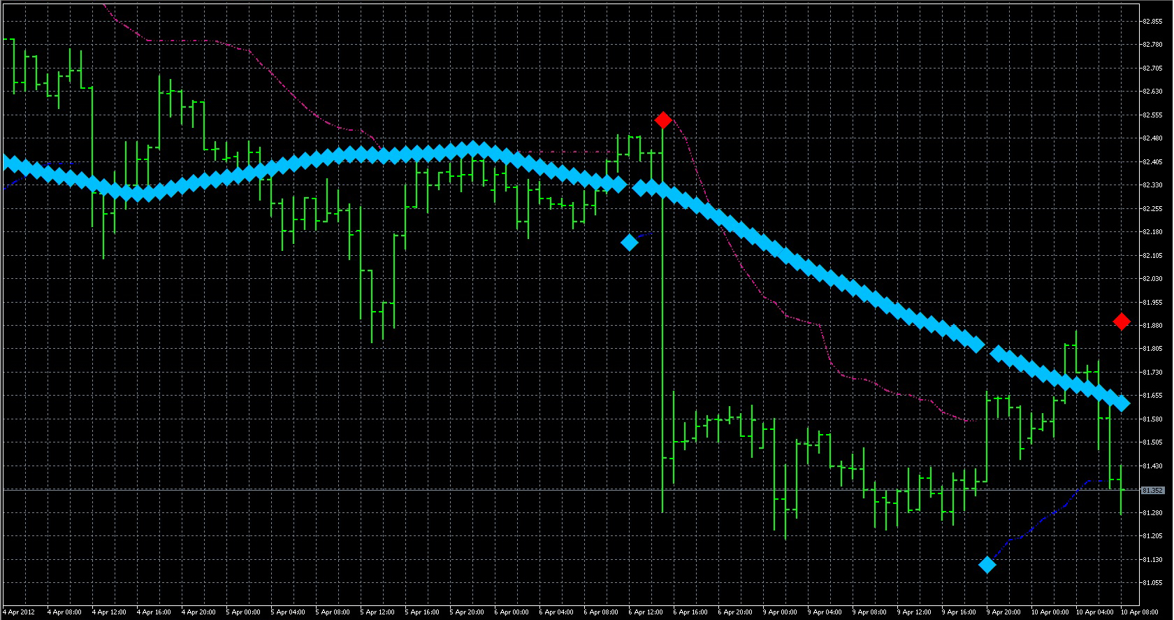 FXのフリーのチャートソフト、メタトレーダー5 (MT5)にインディケーターを表示させた画像です。 画像をクリックすると大きく表示されます。