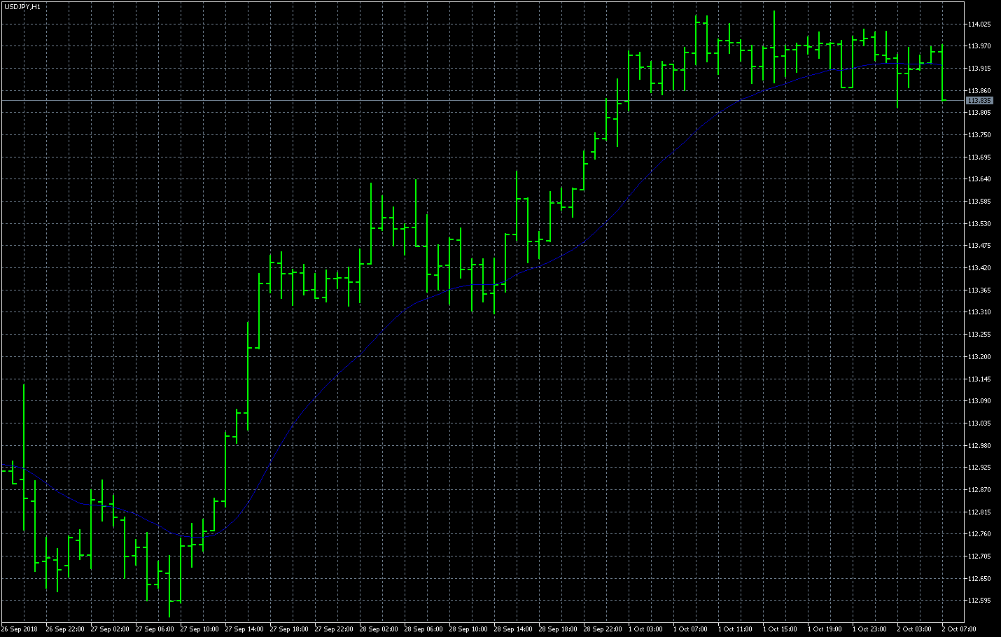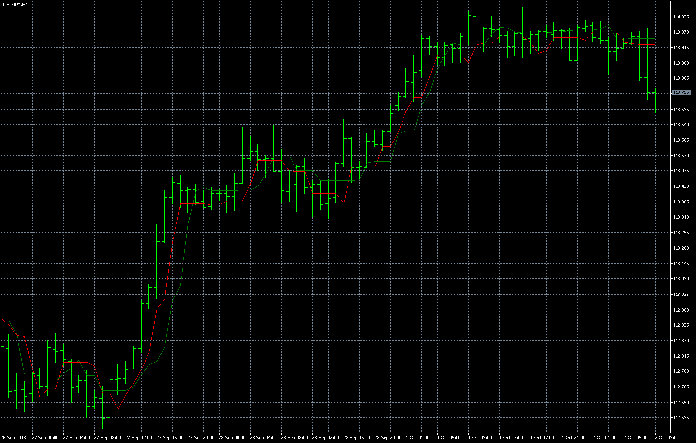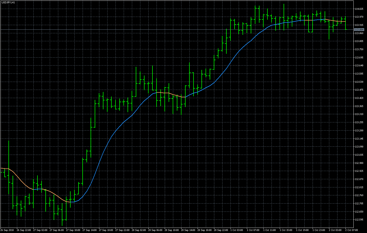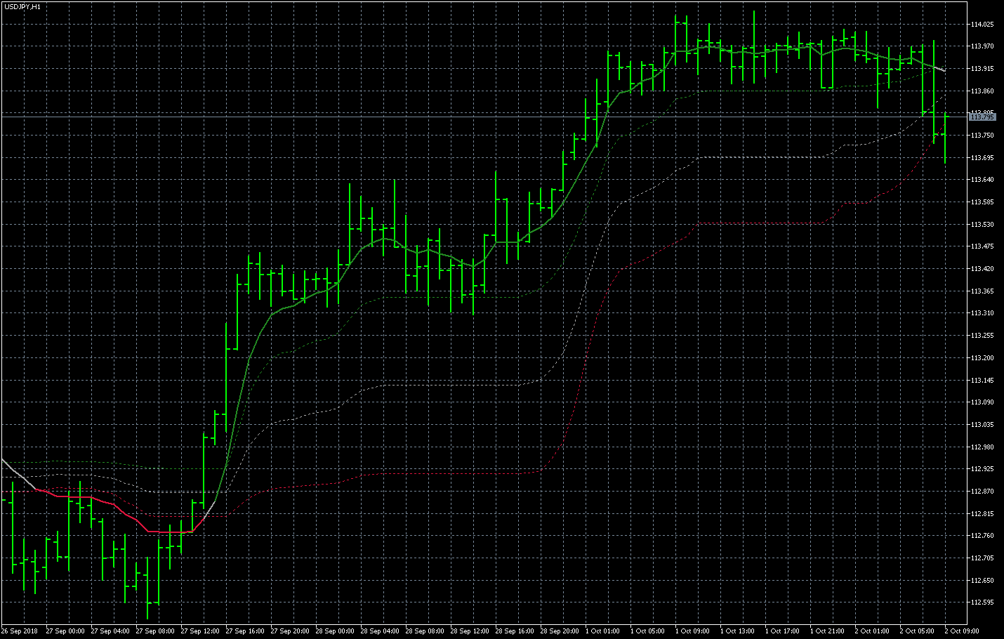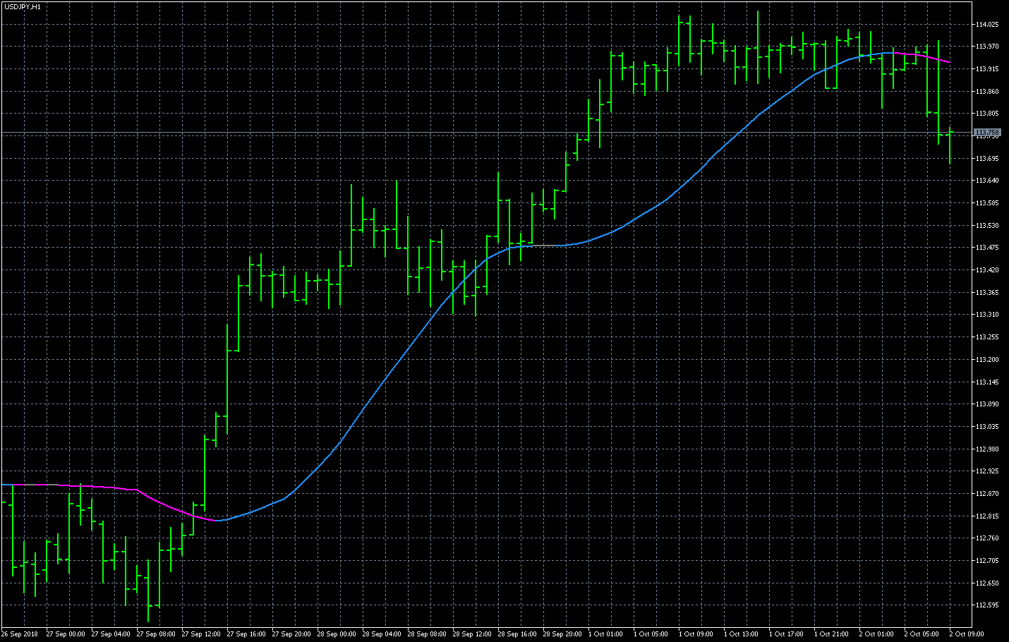 FXのフリーのチャートソフト、メタトレーダー5 (MT5)にインディケーターを表示させた画像です。 画像をクリックすると大きく表示されます。