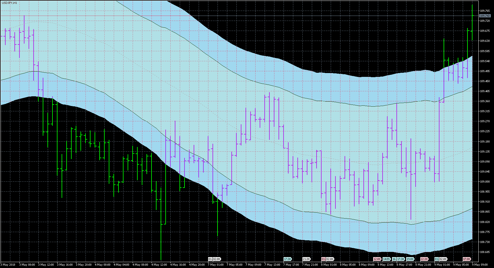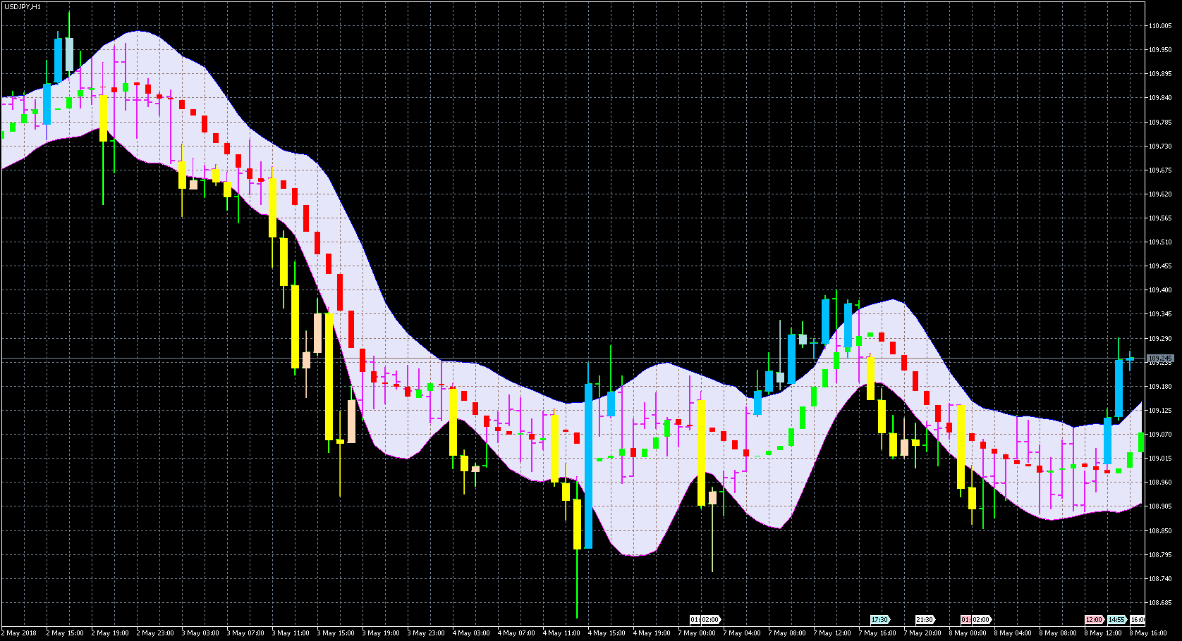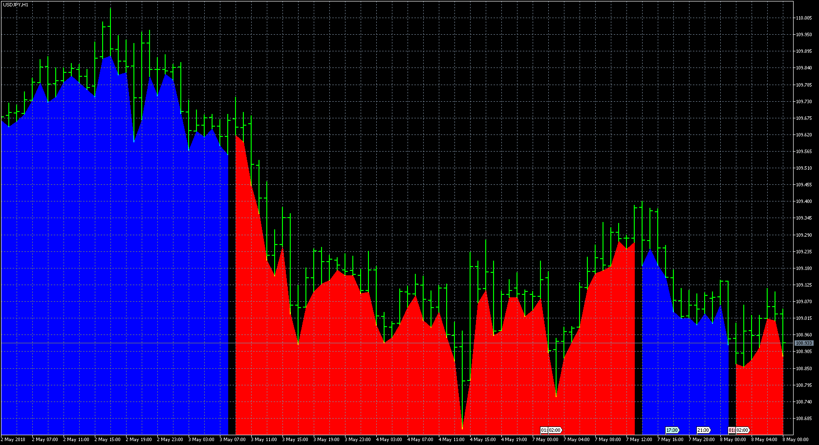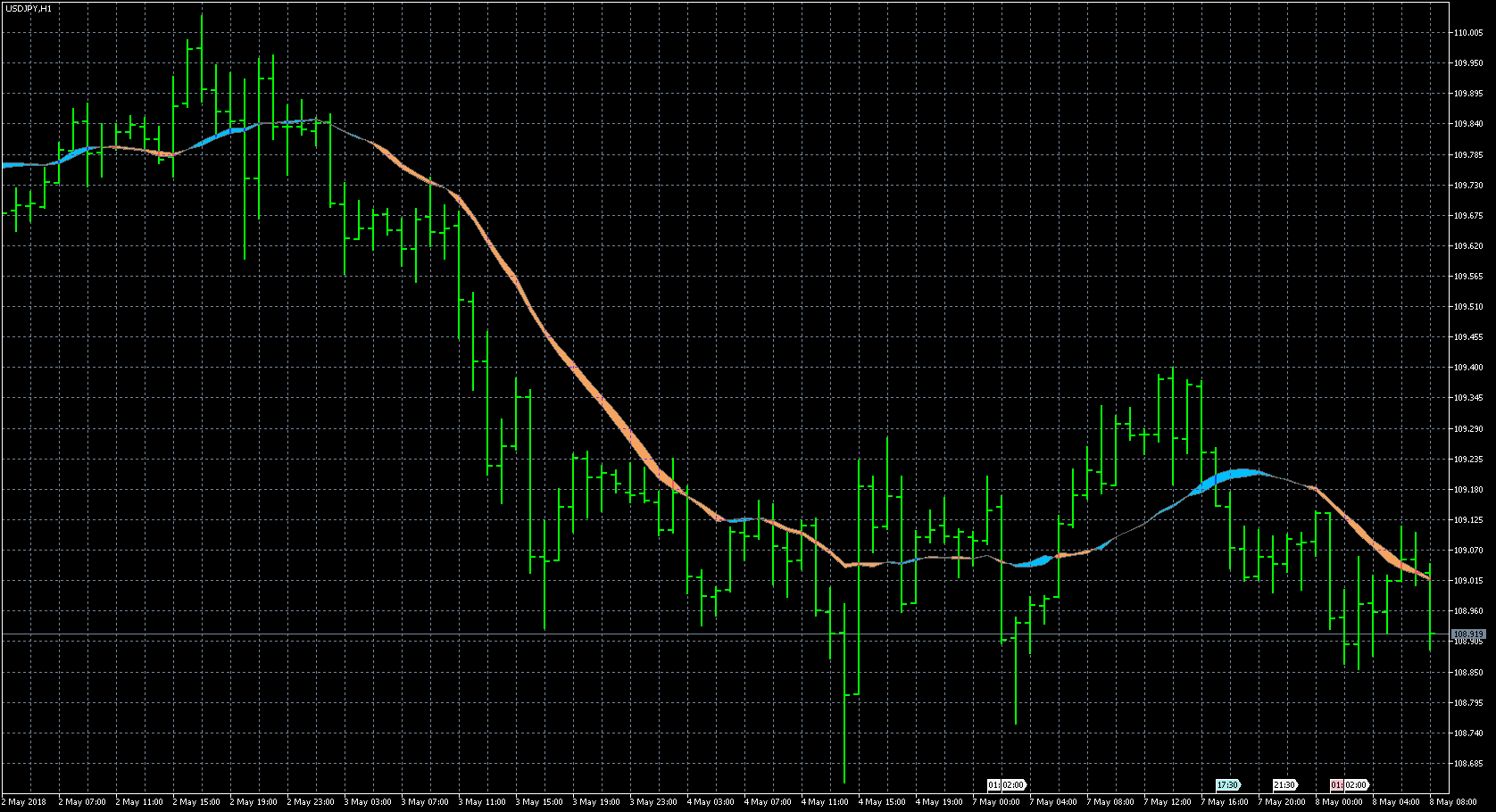 FXのフリーのチャートソフト、メタトレーダー5 (MT5)にインディケーターを表示させた画像です。